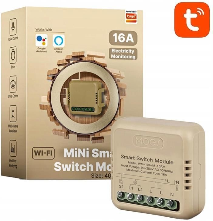 Przełącznik MINI Sterownik Światła WiFi 16A z Pomiarem Energii Moes TUYA Główne Cechy Inteligentny Przełącznik WiFi z Pomiarem Energii Kompatybilny z aplikacją TUYA Smart Life Obsługuje napięcie 90-250V AC i prąd do 16A na kanał Dwa typy przełączników do wyboru: rocker switch lub reset switch Synchronizacja stanu przełączników dla podwójnej kontroli Opis Możliwości Uniwersalny Montaż: Dzięki kompaktowym wymiarom oraz uniwersalnemu montażowi, nasz mini sterownik świetnie sprawdzi się w różnych instalacjach domowych. Sterowanie Dwoma Obwodami: Pozwala na sterowanie punktami oświetlenia lub gniazdkami, zapewniając większą elastyczność w zarządzaniu oświetleniem w domu. 🌟 Inteligentne Sterowanie: Aplikacja TUYA Smart Life umożliwia zdalne sterowanie urządzeniami z dowolnego miejsca na świecie, zapewniając wygodę i elastyczność użytkowania. 🌟 Bezpieczeństwo i Efektywność: Dzięki monitorowaniu zużycia energii w czasie rzeczywistym oraz funkcji synchronizacji stanu przełączników, nasz sterownik gwarantuje zarówno bezpieczeństwo, jak i oszczędność energii. 🌟 Wielofunkcyjność: Produkt współpracuje zarówno z przełącznikami ściennymi mono, jak i bistabilnymi, oraz pozwala na ustawienie pamięci stanu w przypadku zaniku zasilania. 🌟 Łatwy Dostęp Zdalny: Zdalny dostęp z każdego miejsca na ziemi przy pomocy aplikacji mobilnej TUYA, SmartLife, zapewniając wygodę użytkowania i kontrolę nad urządzeniami. Specyfikacja Model: MS-104-M16AM Typ Produktu: Moduł Sterownika Smart Switch Napięcie: 90-250VAC 50/60Hz Prąd: 16A/Gang; Łącznie 16A Protokół Bezprzewodowy: Wi-Fi, BLE Temperatura Pracy: -10℃-65℃ Temperatura Obudowy: Tc: +80℃(Max.) Zasięg Działania: ≤70m Wymiary (SxGxW): 40x40x18mm Stopień Ochrony: IP20