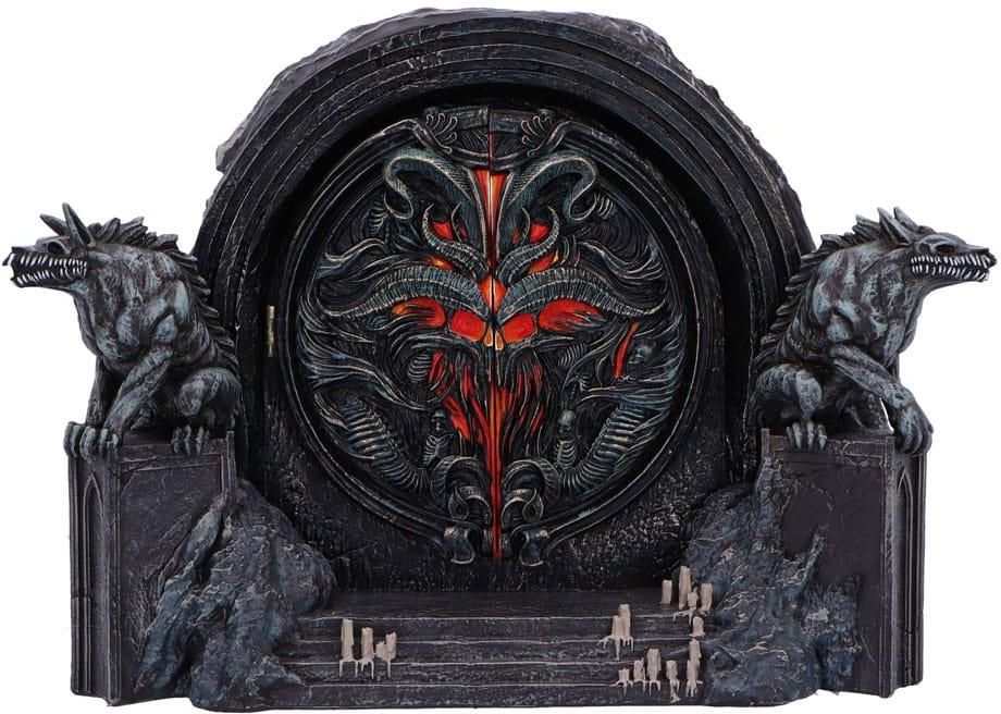 Unleash the darkness with the Diablo IV Hells Gate Box, a must have for gaming enthusiasts and collectors. This intricately crafted piece features the iconic Hells Gate from the game, guarded by two skeletal wolf statues and framed by four ominous steps leading up to the foreboding gate doors. Opening the doors reveals a hidden compartment, perfect for storing chesriched trinkets. Packaged in a stunning Nemesis Now DIablo iV branded gift box, the Hells Gate Box is not only a delightful collectible but also a perfect gift. Size: 16 x 22 x 14 cm