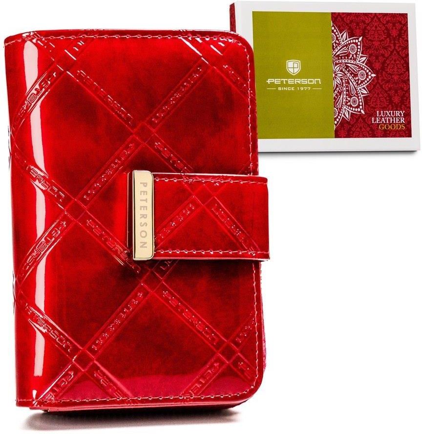 Portfel damski ze skóry naturalnej zamykany na zatrzask i suwak — Peterson Jakość i precyzja wykonania | Odszyty bardzo trwale z doskonałej jakości skóry naturalnej. Skóra na zewnętrznej stronie jest lakierowana i ozdobiona tłoczonym monogramem z logo marki; Portfel średniej wielkości | Portfel …