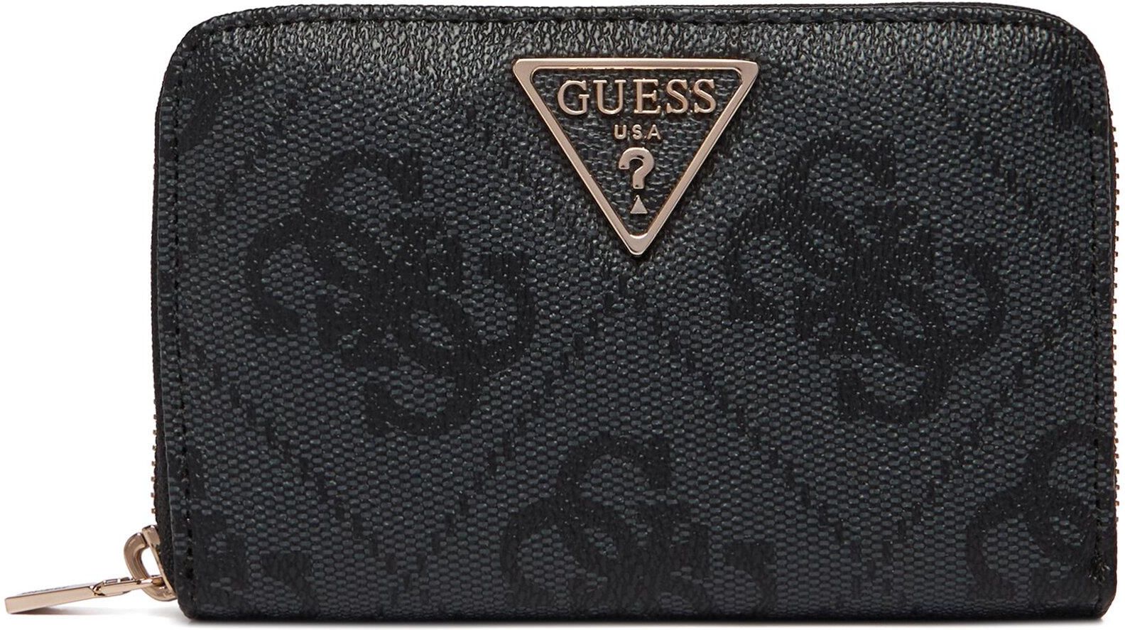 Portfel Guess wymiary: 13 x 9 x 2 cm materiał: 100% poliuretan kolor okuć: złoty skóra syntetyczna po zewnętrznej stronie 6 miejsc na karty dwie przegródki na banknoty kieszeń na bilon zamykana na zamek metalowe logo gwarancja producenta 2 lata