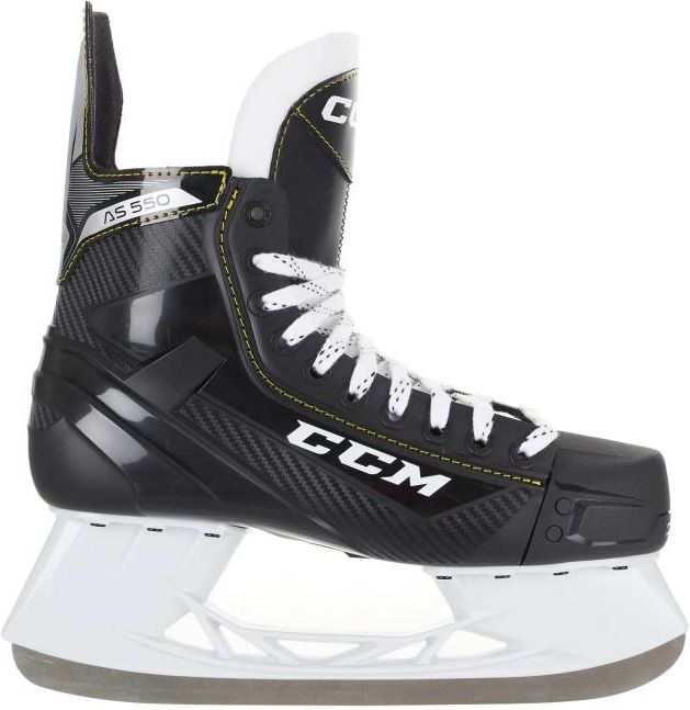 • Uwaga: przed pierwszą jazdą łyżwy należy naostrzyć Firma CCM to prawdziwy weteran branży hokejowej i w zasadzie jedyny producent sprzętu do tej gry, który może stawać w szranki z Bauer jak równy z równym. Jej produkty są świetnym wyborem, niezależnie od tego, o jakiej półce cenowej mówimy. Dziś przedstawimy Wam model Tacks AS-550. Tacks to zdecydowanie najsłynniejsza linia łyżew tej firmy, a jej historia sięga roku 1937! Obecnie są to modele przeznaczone dla osób poszukujących możliwie jak najsztywniejszych, dających doskonałe wsparcie butów, dzięki którym mogą włożyć jak najwięcej siły w odepchnięcie. W sam raz dla tych, którzy nie robią gwałtownych zwrotów i stawiają na szybką jazdę na prostych. Model AS-550 to propozycja dla osób początkujących i grających w hokeja rekreacyjnie. Cena jest naprawdę zachęcająca, dzięki czemu warto rozważyć zakup tych łyżew nawet jeżeli jeździcie kilka razy w sezonie, zamiast korzystania z usług wypożyczalni. Mamy tutaj do czynienia z modelem Tacks, a więc dostajemy relatywnie sztywny but, zwłaszcza jak na tę półkę cenową. Sekret tkwi w skorupie wykonanej w technologii wtrysku do formy – łyżwy te są robione podobnie, jak rolki do jazdy freeskate. Materiał, którego użyto, to plastik z domieszką włókien szklanych, co przekłada się na mocną konstrukcję buta. Sama skorupa jest ukształtowana anatomicznie. Wewnątrz znajdziemy grube pianki, które pozwalają cieszyć się komfortem w zasadzie bez okresu ubijania wyściółki. Są one pokryte chłonną mikrofibrą. Język to tradycyjna konstrukcja z filcu, chroniąca przed lekkimi uderzeniami. Płoza w Tacks AS-550 nie daje możliwości wymiany ostrza, jednak kształtem jest identyczna z tą montowaną w wyższych modelach. Zapewnia dokładnie tak samo świetne przełożenie energii. Ostrze jest wstępnie naostrzone dla bezpieczeństwa kupującego, jednak w celu uzyskania optymalnych doświadczeń konieczne jest skorzystanie z usług serwisu przed pierwszym wyjściem na lód.