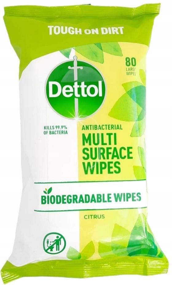 Dettol Chusteczki antybakteryjne Duże 80 szt. Dettol Chusteczki Antybakteryjne o zapachu cytrusowym to skuteczne narzędzie do czyszczenia i dezynfekcji powierzchni w Twoim domu. Te chusteczki są wyjątkowe ze względu na swoje biodegradowalne właściwości oraz przyjemny cytrusowy zapach. Biodegradowalne Materiały: Chusteczki Dettol Multi Surface są wykonywane z biodegradowalnych włókien pochodzenia roślinnego, co oznacza, że są bardziej przyjazne dla środowiska. Wszechstronne Zastosowanie: Nadają się do intensywnego czyszczenia różnych powierzchni w domu, takich jak powierzchnie robocze, kuchenne, zlewy, ekrany prysznicowe, deski sedesowe, wanny, kranie, urządzenia elektryczne i nawet zabawki dziecięce. Ochrona Antybakteryjna: Chusteczki Dettol są zaprojektowane do skutecznego usuwania 99,9% bakterii, w tym takich jak E.Coli, co pomaga w utrzymaniu higieny w domu. Świeży Cytrusowy Zapach: Po użyciu pozostawiają przyjemny cytrusowy zapach, który odświeża powierzchnie i otoczenie. Skuteczność Dezynfekcji: Aby osiągnąć maksymalną skuteczność dezynfekcji, zaleca się używanie jednej chusteczki na powierzchnię o wymiarach 44 x 44 cm oraz pozostawienie powierzchni mokrej przez co najmniej 5 minut. Stosowanie na Twardych, Nieporowatych Powierzchniach: Chusteczki te są przeznaczone do stosowania wyłącznie na twardych, nieporowatych powierzchniach i powinny być dokładnie spłukane wodą. Stosowanie:1. Otwórz pokrywkę zabezpieczającą i wyciągnij chusteczkę. 2. Aby uniknąć wysychania chusteczek szczelnie zamknij opakowanie po każdym użyciu oraz przechowuj opakowanie skierowane pokrywką zabezpieczającą do dołu. 3. Przetrzyj powierzchnię dla uzyskania higienicznej czystości, a następnie wyrzuć chusteczkę. 4. W przypadku powierzchni mających styczność z żywnością używaj tylko do twardych, nieporowatych powierzchni, następnie spłucz dokładnie wodą. W celu usunięcia bakterii pozostaw powierzchnie niespłukane przez 5 min. Przed użyciem produktu należy przetestować w niewidocznym miejscu, aby nie uszkodzić czyszczonej powierzchni. Specyfikacje: Opakowanie: 80 chusteczek Zapach: Cytrusowy Wymiary Chusteczki: Większe niż standardowe Skład Materiałów: Biodegradowalne włókna pochodzenia roślinnego Zawiera: Na 100g zawiera 0,52 g chlorku benzalkoniowego, Zawiera <5% niejonowych środków powierzchniowo czynnych, substancje dezynfekującą, kompozycje zapachową. Wymiary opakowania: 24 x 11 x 5.5 cm kod towaru 10215