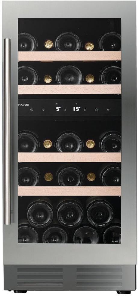 DUNAVOX FLOW-32D DAUF‐32.78DSS Dwustrefowy model podblatowy na 32 butelki z eleganckim wyglądem zewnętrznym i klamką ze stali nierdzewnej. DUNAVOX Flow-32D jest idealny do współczesnych środowisk kuchennych. Butelki wsparte są na solidnych drewnianych półkach i otoczone białym, pomarańczowym i niebieskim wewnętrznym oświetleniem LED. Należy pamiętać, że ten model jest przeznaczony do zabudowy podblatowej. SPECYFIKACJA Butelki (0,75 litra bordeaux): 32 butelki Strefy temperatur: 2 Drzwi: Odwracalne, przyciemniane szklane drzwi (zabezpieczone UV) Kolory: Stal nierdzewna Półki: Drewniane półki Oświetlenie: LED w kolorze białym, pomarańczowym i niebieskim Szerokość: 380 mm Wysokość: 820 mm Głębokość: 563 mm