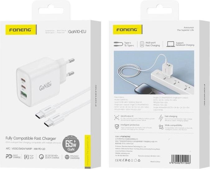 Foneng Ładowarka sieciowa GaN10-EU - USB + 2xTyp C - QC 4.0+ PD 65W z kablem Typ C na Typ C biała Wydajne i wszechstronne ładowanie Moc 65W – Obsługa szybkiego ładowania PD i QC 4.0+. Potrójne porty – 2x USB-C + 1x USB-A dla maksymalnej kompatybilności. Inteligentne dostosowanie mocy – Dynamiczne rozdzielanie energii przy podłączonych wielu urządzeniach. W zestawie kabel USB-C – USB-C – Gotowe rozwiązanie do szybkiego ładowania. Kompaktowa konstrukcja GaN Technologia GaN – Większa wydajność i mniejsza emisja ciepła. Kompaktowy rozmiar – 90 × 45.5 × 32 mm, idealna do podróży. Waga 121g – Lekka i łatwa do przenoszenia. Uniwersalna kompatybilność Szeroki zakres napięcia – Wejście 110-240V, idealne do użytku na całym świecie. Bezpieczna i niezawodna – Ochrona przed przegrzaniem, przepięciami i zwarciami. Specyfikacja techniczna Model: GaN10-EU Wejście: 110-240V, 50/60Hz Wyjścia: USB-C1 (Max PD 65W): 5V-3A, 9V-3A, 12V-3A, 15V-3A, 20V-3.25A USB-C2 (Max PD 20W): 5V-3A, 9V-2.22A, 12V-1.67A USB-A1 (Max 18W): 5V-3A, 9V-2A, 12V-1.5A Ładowanie wieloportowe: C1 (45W) + C2 (20W) = 65W Max | C1 (45W) + A1 (18W) = 63W Max Waga: 121 ± 1g Wymiary: 90 × 45.5 × 32 mm Zawartość zestawu: Ładowarka sieciowa + kabel USB-C – USB-C