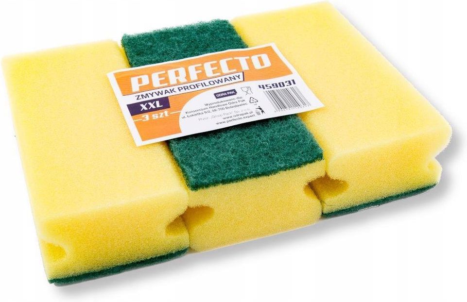 Zmywak kuchenny XXL Perfecto 3 szt. Zmywak kuchenny Perfecto profilowany - dwustronny - miękki / szorstki. Cechy charakterystyczne: - wyprofilowany uchwyt ułatwia trzymanie zmywaka- idealny do zmywania naczyń i garnków. Cena za 3 szt. Odra Pak 459031