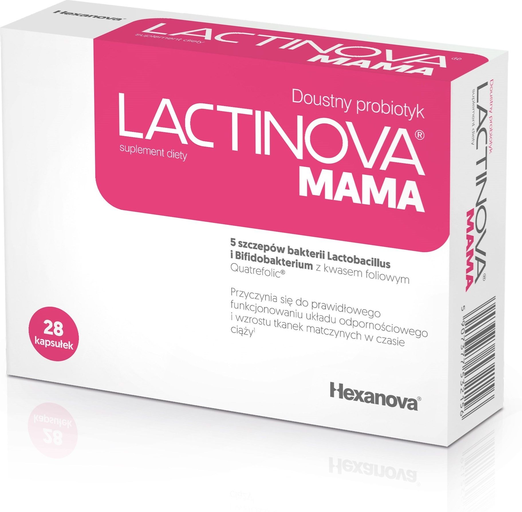 . Hexanova Lactinova Mama 28kaps Lactinova mama to doustny probiotyk nowej generacji, przeznaczony dla kobiet w ciąży i karmienia piersią oraz kobiet planujących ciążę. Bakterie probiotyczne: Lactobacillus oraz Bifidobacterium, zawarte w suplemencie, kolonizują jelito cienkie i grube. Kapsułka Lactinova mama zawiera 4 szczepy bakterii probiotycznych, w tym bakterie kwasu mlekowego Lactobacillus rhamnosus GG i Lactobacillus acidophilus LA02 oraz 2 szczepy ochronnych bakterii z rodzaju Bifidobacterium. Opatentowana technologia mikroenkapsulacji MICROBAC zwiększa trwałość i przeżywalność szczepów bakterii probiotycznych w środowisku soku żołądkowego, żółci i enzymów trawiennych. Zawarte w składzie Lactobacillus rhamnosus GG wzmacniają naturalną ochronę organizmu poprzez wsparcie funkcji barierowej jelita. Lactobacillus acidophilus LA02 wspierają utrzymanie homeostazy jelitowej, przyczyniają się do zmniejszenia dyskomfortu żołądkowo-jelitowego, zmniejszają wzdęcia. Przywracają równowagę funkcji motorycznej jelit oraz równowagę mikroflory po leczeniu antybiotykami. Wzmacniają naturalne mechanizmy obronne organizmu. Dawkowanie 1 kapsułka dziennie lub według zaleceń lekarza. Kapsułkę połykać wyłącznie w całości i popić szklaną płynu (np. wodą). Produkt może być stosowany z preparatami witaminowymi i kwasami omega-3 w tym samym czasie Produkt może być stosowany przez kobiety suplementujące preparaty żelaza, a także w trakcie i po antybiotykoterapii. Probiotyk należy stosować minimum 1 miesiąc. Składniki podłoże prebiotyczne Fibregum™ (aw<0,2), premix probiotyczny MICROBAC o koncentracji 100 mld CFU*/g: (L. rhamnosus GG, Lactobacillus acidophilus LA02, B. breve BR03, B. lactis BS01, B. lactis BA05), sól glukozaminowa kwasu (6S)-5-metylo-tetrahydrofoliowego (kwas foliowy/Quatrefolic®), substancje przeciwzbrylające: sole magnezowe kwasów tłuszczowych, dwutlenek krzemu, składniki otoczki kapsułki: substancja żelująca – hydroksypropylometyloceluloza. ***Nie należy przekraczać zalecanej dziennej porcji. Zrównoważony sposób żywienia i prawidłowy tryb życia jest ważny dla funkcjonowania organizmu człowieka. Suplement diety nie może być stosowany jako substytut (zamiennik) zróżnicowanej diety. Przechowywać w oryginalnym opakowaniu, w temperaturze pokojowej do 25°C, w suchym miejscu, w sposób niedostępny dla małych dzieci. Chronić przed wilgocią i światłem.