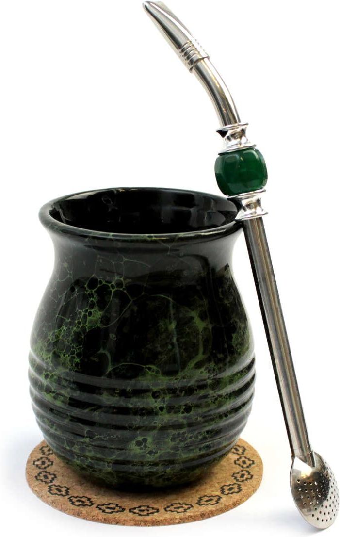 Zestaw idealny by zacząć swoją przygodę z piciem Yerba Mate W zestawie znajduję się Matero ceramiczne z ciemnego marmuru które świetnie będzie leżeć w dłoni. W zestawie znajduje się również Bombilla która jest ozdobiona Zielonym kamieniem chłodzącym. Połączenie tych dwóch produktów sprawi że picie Yerba Mate stanie się o wiele przyjemniejsze. Matero ceramiczne do Yerba Mate Porongo Roches - 360 ml Ta ceramiczna tykwa do yerba mate w kolorze ciemnego marmuru to stylowy design i najwyższe walory użytkowe. Idealnie leży w dłoni i nie wymagające jeśli chodzi o konserwację. Jego pojemność to 360 ml, dzięki czemu pomieści solidną porcję naparu. Można myć je w zmywarce! Bombilla Zielona z kamieniem + czyścik Ta bombilla to produkt wykonany ze stali nierdzewnej wysokiej jakości, który posiada czarny kamień chłodzący oraz czyścik. Jego końcówka ma kształt łyżeczki z dziurkami, co umożliwia idealne filtrowanie napojów ziółkowych, takich jak yerba mate, zapewniając przy tym komfort podczas picia. Gorący napój utrzymuje się w odpowiedniej temperaturze dzięki kamieniowi chłodzącemu, a czyścik ułatwia utrzymanie bombilli w czystości. Stal nierdzewna zapewnia trwałość i odporność na uszkodzenia mechaniczne i wysokie temperatury. Prosty design nadaje elegancji i funkcjonalności. Zaletą jest dołączony czyścik, który pozwoli utrzymać bombillę w czystości. długość: 21 cm Zestaw idealny by zacząć swoją przygodę z piciem Yerba Mate