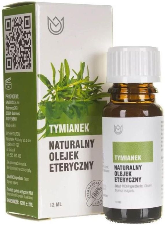 TYMIANEK – Naturalny olejek eteryczny [img-3888-right-home_default] Łacińska nazwa: Thymus zygis (Loefl.) L. Destylowana część roślin: Wierzchołki kwiatów Pochodzenie: Hiszpania Producent: Naturalne Aromaty Tymiankowy olejek eteryczny wykazuje właściwości antysceptyczne, przeciwbakteryjne i przeciwgrzybiczne. Polecany przy przeziębieniach, grypie i katarze. Działa wykrztuśnie, wspomaga leczenie infekcji dróg oddechowych. Korzystnie wpływa na proces trawienia, skutecznie pobudza pracę jelit oraz wątroby. Zalecany w stanach szoku, atakach histerii i silnego zdenerwowania, skutecznie redukuje stres. Olejki eteryczne mogą być używane pojedynczo lub mieszane z innymi dla wzmocnienia aromatu lub uzyskania nowego zapachu. Zastosowanie Masaż - Do masażu, 3-5 kropli wymieszać z jedną łyżką oleju nośnikowego np. oliwa z oliwek, itp. Kąpiel - Do kąpieli, 10-15 kropli na wannę letniej wody, podawać w strumieniu wlewanej wody. Sauna - Dodaj kilka kropel olejku do wody i polej rozgrzane kamienie. Zasypianie - Skropić róg poduszki olejkiem eterycznym, aby ułatwić zasypianie. Pranie - Dodać ulubiony aromat do proszku do prania lub skropić prane ubrania. Mycie - Wlać kilka kropel dowolnego olejku zapachowego do wiadra z wodą do mycia podłogi. Odświeżanie powietrza - Nasączyć gazik i wciągnąć go na początku odkurzania, w celu aromatyzowania powietrza. Samochód - skropić olejkiem o ulubionym zapachu wycieraczkę pod drzwiami domu lub w aucie. Nasączyć wyschniętą choinkę samochodową lub uzupełnić pusty wkład odświeżacza powietrza. Użytkowanie Nie stosować doustnie. Nie stosować w czasie ciąży. Nie stosować nierozcieńczonego olejki bezpośrednio na skórę. Może powodować uczulenie w kontakcie ze skórą. W razie połknięcia niezwłocznie zasięgnij porady lekarza. Unikać kontaktu z oczami i błonami śluzowymi.