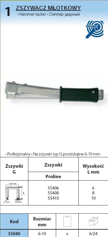 55040 Zszywacz młotkowy typ G, 6-10 mm, Proline 55040 Zszywacz młotkowy typ G, 6-10mm, Proline Na zszywki typ G prostokątne 6-10 mm Na zszywki Proline 55406, 55408, 55410, 55412, 55414