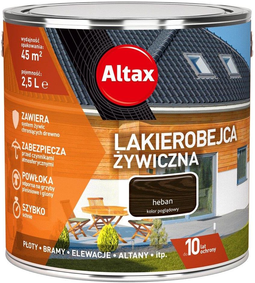 ALTAX LAKIEROBEJCA ŻYWICZNA 2,5L Kolor: HEBAN Altax Lakierobejca Żywiczna to system wysokogatunkowych żywic aktywnie chroniących drewno przed wodą, śniegiem, słońcem nawet do 10 lat. Żywice głęboko wnikają w drewno, mocno je odżywiając i wzmacniając jego strukturę. Tworzą elastyczną niełuszczącą się powłokę odporną na grzyby pleśniowe i glony. Nowoczesna technologia zapewnia szybkie schnięcie produktu - produkt jest suchy w dotyku już po 1 godzinie. Lakierobejca nadaje drewnu piękne satynowe wykończenie efektywnie podkreślając rysunek drewna. WŁAŚCIWOŚCI jest elastyczna - nie łuszczy się i nie pęka, więc idealnie nadaje się do malowania zarówno dużych jak i małych powierzchni: podbitek dachowych, elewacji, płotów, bram, altan, mebli ogrodowych itp. odporna na pleśnie i glony powłoka zabezpiecza drewno przed czynnikami atmosferycznymi: wodą, wilgocią, śniegiem oraz promieniowaniem UV podkreśla naturalny rysunek drewna i zapewnia szlachetne, jedwabiste wykończenie to idealny wybór dla tych, którzy chcą połączyć wysoka trwałość zabezpieczenia z łatwością pracy ZASTOSOWANIE: płoty, elewacje, pergola, podbitki, bramy, meble ogrodowe, altany, drzwi WYKOŃCZENIE: satynowe WYDAJNOŚĆ: ok. 18 m² z 1L PRZEZNACZENIE: na zewnątrz (nadaje się również do wnętrz) SPOSÓB APLIKACJI: pędzel syntetyczny Altax Lakierobejca Żywiczna to system wysokogatunkowych żywic aktywnie chroniących drewno przed wodą, śniegiem, słońcem nawet do 10 lat. Żywice głęboko wnikają w drewno, mocno je odżywiając i wzmacniając jego strukturę.