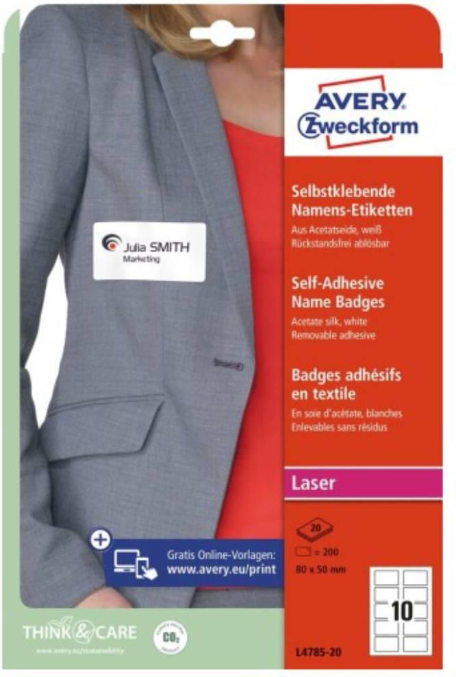 Samoprzylepne identyfikatory imienne 80 x 50 mm Żadnego zgadywania, żadnych wątpliwości co do tożsamości - po prostu łatwość naklejenia i pewność pozostania na miejscu. To właśnie otyrzymujesz dzięki samoprzylepnym identyfikatorom. Zwiększona elastyczność pozwala identyfikatorowi zginać się tak jak ubranie i pewnie przylegać do materiału bez zawijania się na rogach czy odklejania. Dodatkowo specjalna technologia Peel-Away pozwala szybko i łatwo oddzielać identyfikatory, co w znacznym stopniu oszczędza czas podczas sortowania i rozdawania identyfikatorów podczas dużych wydarzeń. doskonałe do wszechstronnych zastosowań jak adresowanie kopert, oznaczanie produktów oraz sprzętów supermocny klej pewnie przylega nawet na kartonie certyfikat braku zacięć potwierdzony przez TÜV wyraźny wydruk ekologiczne etykiety ze znakiem FSC
