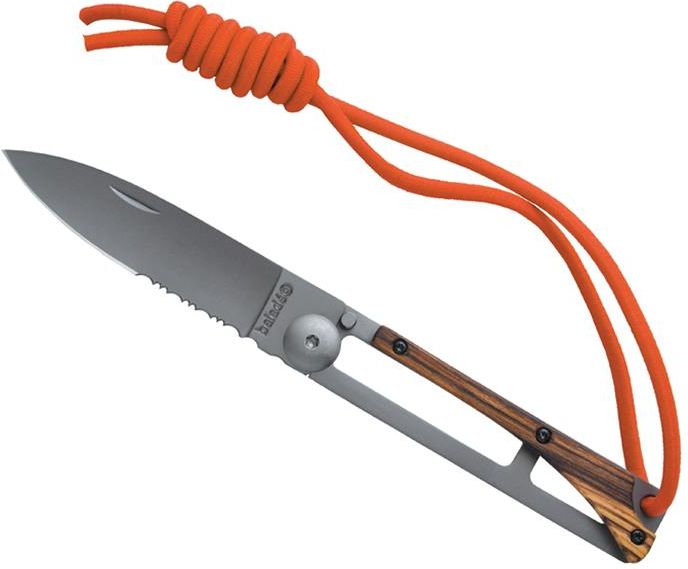 Baladeo Nóż turystyczny Baladeo Papagayo Skinny Nóż turystyczny Baladeo Papagayo Skinny to niewiele ważący model, który stanie się niezastąpionym towarzyszem górskich trekkingów, biwaków, czy campingów. Jego wszechstronność z pewnością zachwyci każdego miłośnika życia w terenie. Składane noże są bezpieczniejsze podczas transportu, a jednocześnie nie zajmują zbyt wiele miejsca. Po otwarciu tego modelu można cieszyć się niezwykle wygodnym uchwytem łączącym w sobie stal nierdzewną oraz wyjątkowo stylistycznie wyglądający kawałek drewna. Projektanci Baladeo z tym modelem doskonale wpisują się w nurt minimalizowania wagi górskiego ekwipunku, co przekłada się na efektywność każdego trekkingu i biwaku. Nóż Baladeo Papagayo Skinny posiada konstrukcję szkieletową, co właśnie sprawia, że jego waga nie jest wysoka. Dla zwiększenia stabilności chwytu rękojeść posiada dodatek w postaci drewnianego fragmentu. Prócz większej ergonomii w trakcie korzystania z tego modelu drewno nadaje mu unikatowego charakteru. Ostrze blokowane jest za pomocą systemu Liner Lock, co chroni przed przypadkowym jego złożeniem podczas korzystania z noża. Jego obsługa odbywa się za pomocą kciuka i jest niezwykle prosta. Samo ostrze noża Baladeo Papagayo Skinny to konstrukcja typu Combo. Łączy ona w sobie gładką powierzchnię z ząbkowaną, co czyni z tego modelu na prawdę funkcjonalny element outdoorowego ekwipunku. Materiałem, z którego prócz drewna wykonano nóż Baladeo Papagayo Skinny jest stal nierdzewna. Dzięki temu model ten nie skoroduje podczas korzystania z niego w wilgotnych biwakowych warunkach, co pozwoli na długo zachować jego trwałość. Dodatkowo stal noża pokryta została powłoką tytanową zwiększającą wytrzymałość zastosowanego metalu. Do tego modelu dołączona została kontrastowa linka służąca do przytroczenia noża do paska, górskiego plecaka lub może zostać wykorzystana jako pętla nadgarstkowa. Nóż turystyczny Baladeo Papagayo Skinny to niezwykle funkcjonalny model, który dzięki zastosowaniu wytrzymałej stali świetnie zniesie warunki panujące na biwaku, trekkingu, czy podczas każdej innej outdoorowej aktywności. Baladeo Papagayo Skinny - najważniejsze cechy Ostrze wykonane z wytrzymałej stali nierdzewnej 420 pokryte tytanem; Konstrukcja szkieletowa zapewnia wygodę użytkowania oraz niską wagę noża; Dodatek drewna sprawia, że uchwyt jest ergonomiczny i stabilniejszy; Blokada Liner Lock uniemożliwiająca przypadkowe złożenie ostrza; Łatwa obsługa blokady odbywa się poprzez odgięcie kciukiem blaszki; Ostrze typu Combo łączy w sobie powierzchnię gładką oraz ząbkowaną; Ząbki ostrza świetnie sprawdzą się w warunkach outdoorowych; Dołączana kontrastowa linka pozwala przytroczyć nóż do paska lub utrzymanie go na nadgarstku.