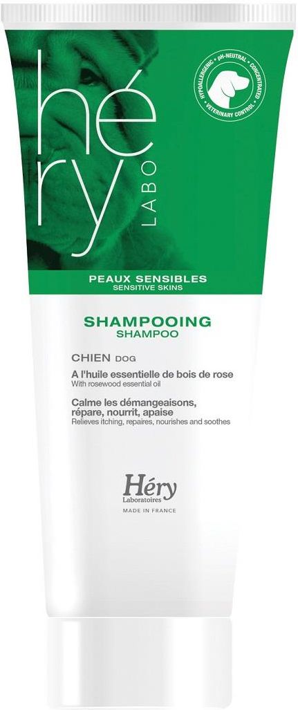 Hery Peaux Sensibles Shampooing 200 ml - szampon regenerujący do zniszczonej sierści Hery Peaux Sensibles toszampon silnie regenerujący, odżywczy oraz przeciwłupieżowy. Produkt przeznaczony jest dla psów ze zniszczoną sierścią poprzez złą pielęgnację. Zawiera ekstrakt alg morskich oraz olejki z drzewa różanego. Doskonale łagodzi podrażnienia, może być stosowany nawet przy poranionej lub chorej skórze. Użyty trzykrotnie w ciągu dwóch tygodni w widoczny sposób poprawia kondycję skóry i sierści. Dla zwierząt wyjątkowo wrażliwych, skłonnych do podrażnień i alergii skórnej ten szampon nie ma sobie równych. Sposób użycia: Na dokładnie zmoczoną sierść nanieść szampon, równomiernie rozprowadzić, delikatnie wmasować i obficie spłukać wodą. Ponownie nałożyć szampon, wymyć i bardzo dokładnie spłukać. Odcisnąć sierść ręcznikiem i wysuszyć niezbyt gorącą suszarką. Pojemność: 200ml