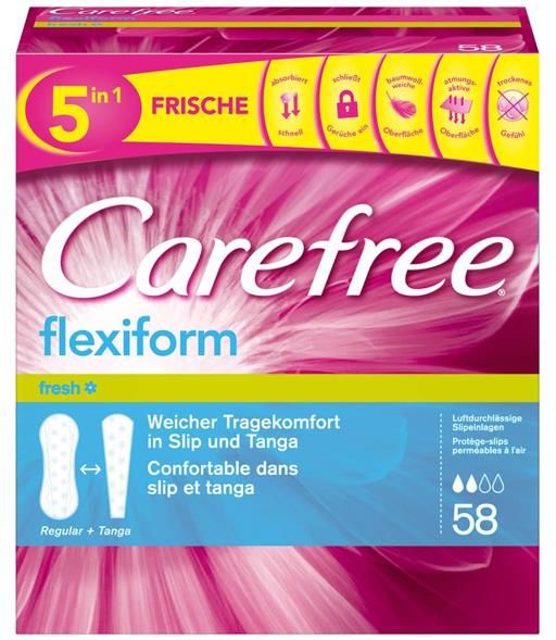 Wkładki higieniczne Carefree FlexiForm Fresh (Zapachowe), 58 sztuk Wkładki higieniczne Carefree FlexiForm Fresh zostały zaprojektowane tak, aby idealnie pasowały do obydwu rodzajów bielizny: zwykłej i string. Gdy zakładasz stringi po prostu zagnij wytłoczone brzegi umieszczone z tyłu wkładki pod spód bielizny, aby wkładka się nie przemieszczała. Używaj jak zwykłą wkładkę, gdy zakładasz klasyczną bieliznę. Przewiewne wkładki o delikatnym, świeżym zapachu. Delikatna dla skóry Twój dzień potrafi być intensywny. Praca, czas z rodziną, spotkania z przyjaciółmi oraz to co lubisz najbardziej. Twoje hobby. Sprawnie się organizujesz by móc ze sobą wszystko pogodzić tak, jak lubisz. Realizując ten plan, chcesz czuć się komfortowo i świeżo. Rozumiemy to, dlatego stworzyliśmy wkładki Carefree. Czujesz się komfortowo i wygodnie przez cały dzień. Przekonaj się sama.
