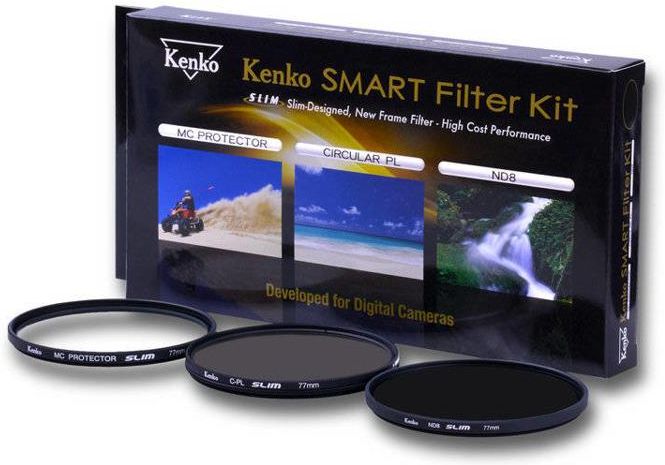 Zestaw startowy filtrów "Smart Filter Kit" zawiera 3 główne filtry w jednym estetycznym opakowaniu. Został zaprojektowany specjalnie dla początkujących i amatorów fotografii jako początkowy zestaw do przygody z fotografią. Zestaw zawiera filtry: Kenko SMART MC Protector Slim- filtr ochronny. Kenko Circular PL Slim - filtr polaryzacyjny cyrkularny. Kenko ND8 Slim- filtr neutralnie szary. Zestaw jest dostępny w szerokim zakresie rozmiarów od 37 mm do 82 mm, i pokrywa w większości obiektywy stosowane w aparatach bezlusterkowych oraz lustrzankach DSLR. Powłoka antyrefleksyjna filtrów została specjalnie opracowana pod kątem matryc stosowanych w aparatach oraz kamerach cyfrowych. Ramki filtrów wykonano z aluminium metodą obróbki skrawaniem dające pewność dokładnego przylegania oraz bezproblemowego wkręcania w gwint obiektywu. Pierścień czerniony metodą galwanotechniczną uzyskał czarną strukturę eliminującą odbicia światła. . Wykonany w wersji cienkiej (slim) umożliwia stosowanie filtrów z szerokokątnymi obiektywami bez obawy o winietowanie.
