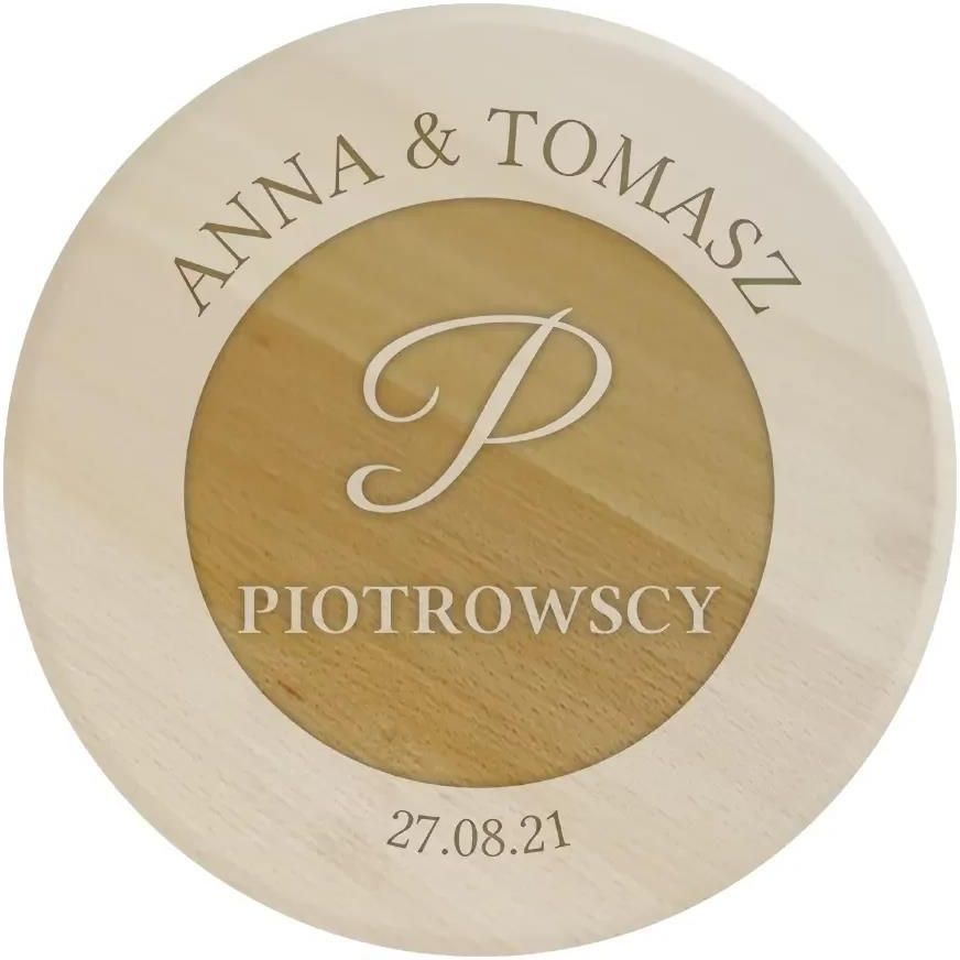 Drewniana deska obrotowa z grawerem. Idealna dla Ciebie, a także na prezent dla bliskiej Ci osoby. Wymiary deski: średnica 350 mm / grubość blatu 18 mm W komentarzu do zamówienia podaj imiona Młodej Pary, odmienione nazwisko (w takiej formie jaka ma się znaleźć na skrzynce) oraz datę ślubu.* Produkty z własnym nadrukiem nie podlegają zwrotowi ani wymianie.