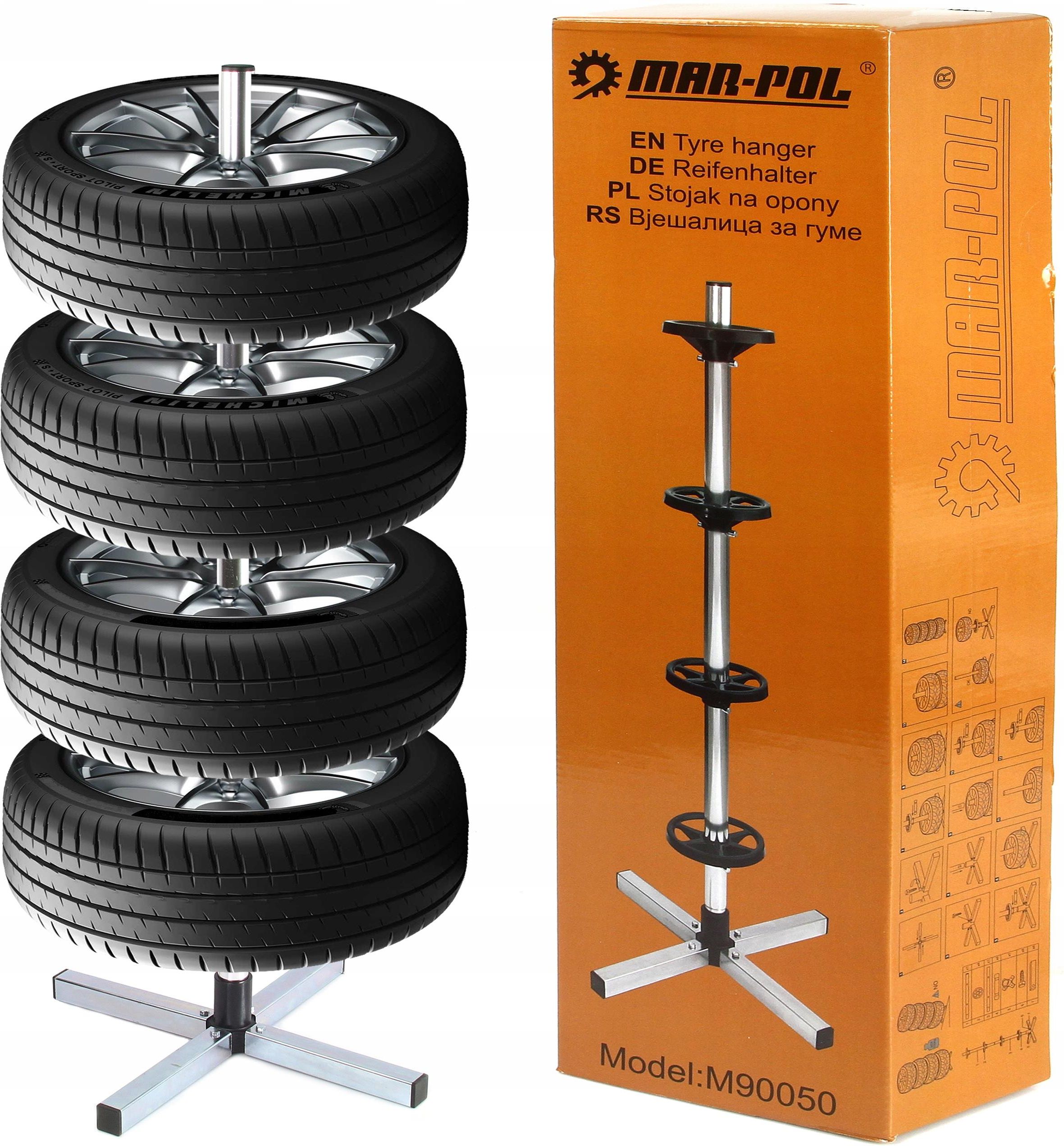 Mar-Pol Stojak Do Opon/Alufelg/Felg Stalowych/Kół M90050 Stojak na koła / opony / felgi aluminiowe / felgi stalowe. Stojak ma możliwość pomieszczenia max 4 kół o szerokości max 235 mm, w przypadku mniejszej ilości kół rośnie proporcjonalnie max. szerokość opony. Regulowane wsporniki / przekładki – możliwość odjęcia dowolnej podstawki w celu zwiększenia maksymalnej szerokości opony. Cechy produktu Stojak stoi stabilnie na czteroramiennej podstawie. Jest lekki,poręczny i łatwy w przemieszczaniu. W zestawie 4 bolce do blokowanie pozycji wsporników. Stojak składany z dwóch części Mocna i lekka konstrukcja Stojak zabezpieczony czarną farbą Zestaw wraz z kompletem śrub montażowych Dane techniczne Wysokość całkowita: 109 cm Średnica wsporników: 14,7 cm Wysokość wsporników: 1,7 cm Średnica rury głównej: 3,5 cm Odległość między wspornikami / przekładkami: 235 mm (regulowana) +/– wsporniki swobodnie przemieszczają się po osi rury