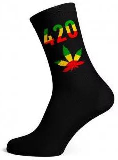 Skarpety męskie 420 długie rozm. 40-45 Skarpety męskie długie z nadrukiem 420 i liściem marihuany. Rozmiar: 40-45. 4 kolory do wyboru: - czarne/rasta - czarne/zielone - białe/zielone - czarne/neon zielony