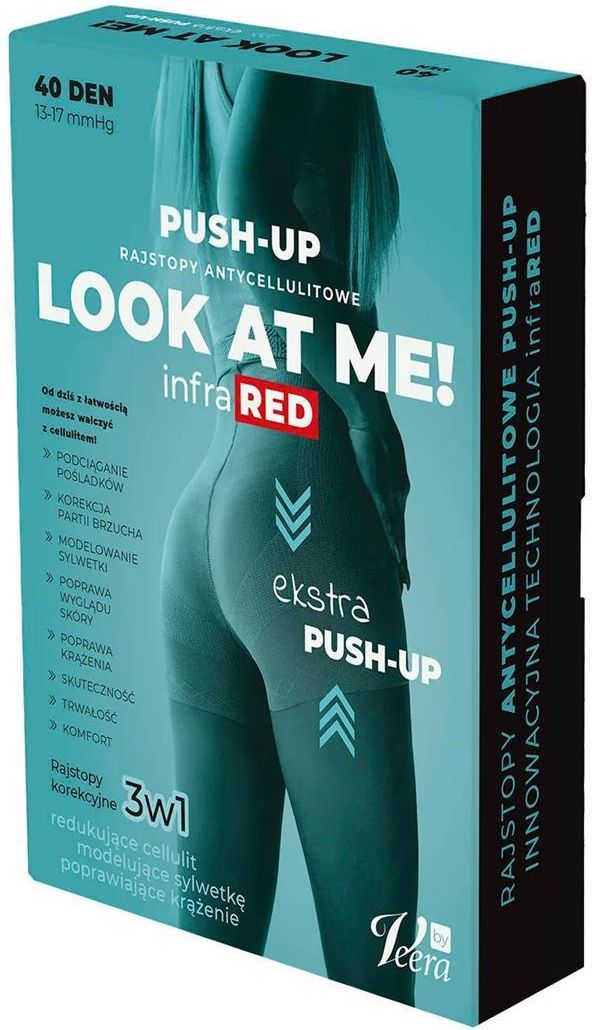 Wybierz rajstopy, w których będziesz czuć się w 100% komfortowo i świetnie wyglądać. Rajstopy Push-up podkreślą Twoje naturalne piękno i kobiece kształty. Dodadzą Ci pewności siebie. To nie są zwykłe rajstopy, ale produkt który pokochasz. Dzięki innowacyjnej technologii pracują dla Ciebie przez cały dzień zapewniając: skuteczną walkę z cellulitem, poprawę krążenia krwi, widoczną od razu korekcję partii brzucha i pośladków. Rajstopy antycellulitowe Look At Me by Veera to połączenie nauki i wieloletniego doświadczenia uznanego producenta wyrobów uciskowych by stworzyć nowość dopracowaną w każdym calu. Od teraz możesz skutecznie walczyć z cellulitem „przy okazji”. Wystarczy założyć rano rajstopy, które przez cały dzień będą pracować dla Ciebie, podczas gdy ty będziesz zajęta swoimi sprawami. Tego właśnie potrzebują współczesne kobiety! Poznajcie wyjątkową nowość! Rajstopy korekcyjne 3w1 zapewniające od teraz perfekcyjne modelowanie całej sylwetki. To najnowsza wersja rajstop antycellulitowych LOOK AT ME, które stały się bestsellerem 2021 roku. podciąganie pośladków korekcja partii brzucha modelowanie nóg Jak rajstopy mogą skutecznie redukować cellulit? Naturalnie! Rajstopy Look At Me wykonane są z przędzy Nilit Innergy. Jest to przędza poliamidowa z mikrofibry z właściwościami generowania głębokiego promieniowania podczerwieni (FIR — Far InfraRed). Naturalny dodatek mineralny znajdujący się w strukturze przędzy przekształca energię termiczną ludzkiego ciała w FIR i odbija ją z powrotem do głębokich tkanek skóry, powodując delikatne podniesienie ich temperatury. Delikatne ciepło powodowane przez promieniowanie podczerwone ożywia i energetyzuje organizm oraz pomaga zredukować objawy cellulitu. Temperatura w komórkach podniesiona jest o 1,14 stopnia Celsjusza, a to polepsza metabolizm! Część majtkowa w rajstopach Look At Me działa antycellulitowo, natomiast nogawka ma klasyczne właściwości rajstop uciskowych marki Veera. Dzięki stopniowanemu uciskowi stosujesz profilaktykę przeciw żylakową. Nogi stają się lżejsze i mniej zmęczone. Redukujesz objawy takie jak: ból, obrzęki i uczucie zmęczenia nóg. Rajstopy Look At Me to produkt dopracowany w każdym calu, dlatego oprócz skutecznego działania postawiliśmy na komfort i uczucie piękna podczas ich noszenia. Bardzo trwałe dzięki specjalnemu splotowi Modelują perfekcyjnie nogi Niezwykle wygodne, dopasowują się do Twoich nóg niczym druga skóra. zaznaczona pięta i palce to dodatkowy atut, dzięki czemu już więcej nie będziesz musiała się zastawiać podczas zakładania rajstop, gdzie jest ich przód, a gdzie tył Pięknie zapakowane w trwałe pudełko, co pozwala na wielokrotne chowanie produktu po zakończeniu użytkowania Rajstopy Look At Me podzielone są na DWIE STREFY. Każda z nich aktywnie działa przez cały czas noszenia poprawiając Twoje zdrowie, komfort oraz uczucie piękna. STREFA WALKI Z CELLULITEM to część majtkowa zakończona piękną koronką. To strefa w której dzięki działaniu głębokich fal podczerwieni skutecznie redukujesz formacje cellulitu i poprawiasz całościowo wygląd skóry STREFA POPRAWY KRĄŻENIA to część nogawkowa. To strefa w której działa stopniowany ucisk poprawiający krążenie, redukujący bóle i zmęczenie nóg. Zgodnie z ustawą o prawach konsumenta dot. art. 38 po otwarciu opakowania i przymiarce produktu, ze względu na ochronę zdrowia oraz higienę – produkt NIE PODLEGA ZWROTOWI.