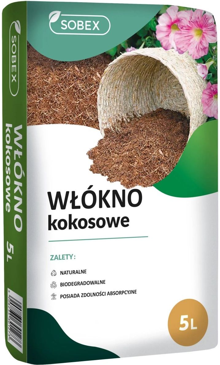 Sobex Włókno kokosowe - 5 l Produkt naturalny, składający się z rozdrobnionych łupin i włókien owoców palmy kokosowej. Wykorzystywany w ogrodnictwie jako samodzielne podłoże lub jako składnik mieszanek podłożowych.
