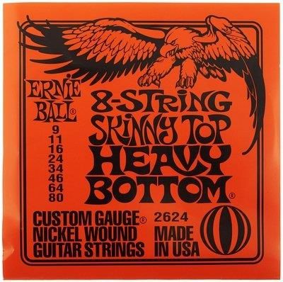 Struny Ernie Ball 8-String Skinny Top Heavy Bottom Nickel Wound 9-80 (2624) Komplet strun Ernie Ball do gitary elektrycznej 8-strunowej. .009 - .011 - .016 - .024 - .034 - .046 - .064 - .080 Posiadają stalowy, cynowany rdzeń o przekroju heksagonalnym, a wykonana z wysokogatunkowej niklowanej stali owijka, zdecydowanie przedłuża czas ich użytkowania uodparniając je na korozję. Do zapakowania tych strun, użyta została technologia o nazwie Element Shield, która ma na celu chronić je przed negatywnym wpływem warunków atmosferycznych, jak chociażby wilgoć czy wahania temperatury. Wszystko to powoduje, że charakteryzują się miękkim, pozbawionym metalicznej nuty brzmieniem. Dodatkowo, po założeniu w gitarze, nie wymagają długiego okresu adaptacji, przez co z powodzeniem mogą być zastosowane podczas koncertu, gdy ważne jest aby szybko odzyskać możliwość kontynuowania gry. Rzecz jasna, świadczy to o wysokiej jakości ich nawijania. Na tle pozostałych producentów, struny Ernie Ball Regular Slinky charakteryzują się niezwykłą miękkością i łatwością podczas gry, co zdaje się być zaletą zwłaszcza dla początkujących gitarzystów, których opuszki palców nie są do końca przyzwyczajone do gry. Z produktów firmy Ernie Ball korzystają takie gwiazdy jak: James Hetfield, Eric Clapton, Jimmy Page, Slash, Steve Vai, John Petrucci, Jeff Beck, Angus Young, The Edge, Kirk Hammett.
