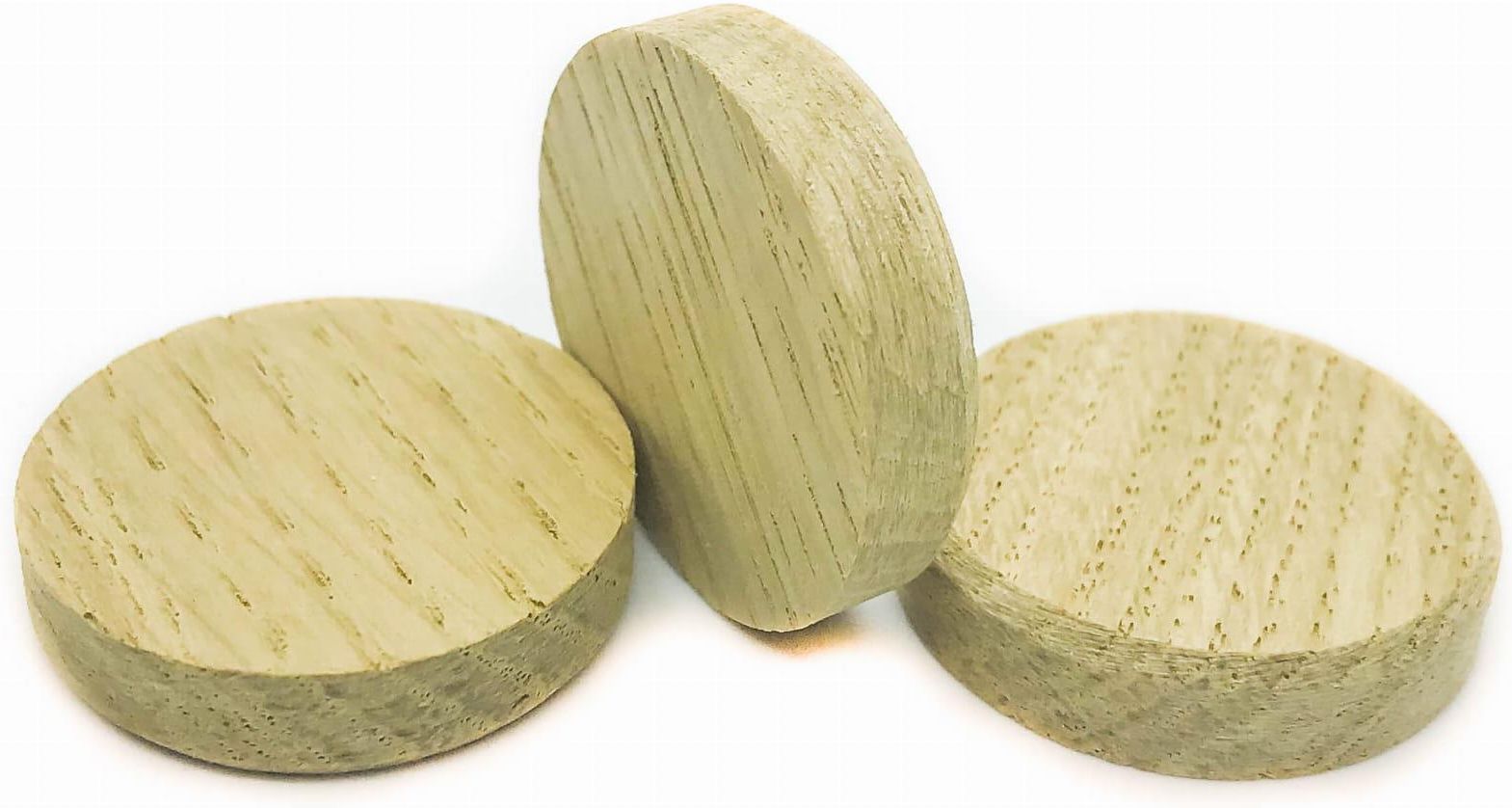 Fleki drewniane z deski DĄB fi 15 mm - (opakowanie - 100 szt.) Solidnie i precyzyjnie wykonane dębowe fleki z deski o średnicy 15 mm Słoje oferowanych fleków są LEŻĄCE czyli ułożone wzdłuż płaszczyzny zaślepki. Dzięki temu ich powierzchnia wchłania lakier lub bejcę identycznie jak powierzchnia zaślepianego materiału. WYMIARY: - średnica - 15 mm - wysokość - 7 mm Aby zachować odpowiednie pasowanie średnicy zaprawek są one powiększone od 0,2 do 0,4 mm - na zacisk. Fleki stosuje się zwykle do zamaskowania ubytków w drewnie, a także przy montażu altan, mebli ogrodowych, elewacji oraz innych elementów drewnianych w celu ich estetycznego wykończenia.