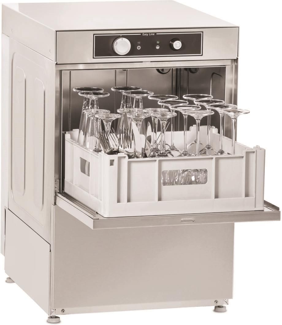 Zmywarka gastronomiczna do szkła Easy Line. Wbudowany dozownik płynu nabłyszczającego. Zawór zwrotny, który zapobiega cofaniu się wody. Dolne i górne ramiona myjące i płuczące. Wydajność orientacyjna do 30 koszy na godzinę. Termostat bezpieczeństwa, który pozwala na kontrolę temperatury mycia 60ºC oraz wyparzania 85ºC. Cykl mycia wynosi 120 s W wyposażeniu 2 kosze o wymiarach 40x40 cm, 1 stojak na talerze oraz pojemnik na sztućce CU. Uwaga: PRODUKT NA ZAMÓWIENIE. Mycie w zmywarce gastronomicznej może się odbywać wyłącznie przy użyciu profesjonalnych środków chemicznych przeznaczonych do zmywarek przemysłowych. Zmywarka powinna mieć zamontowany uzdatniacz wody.