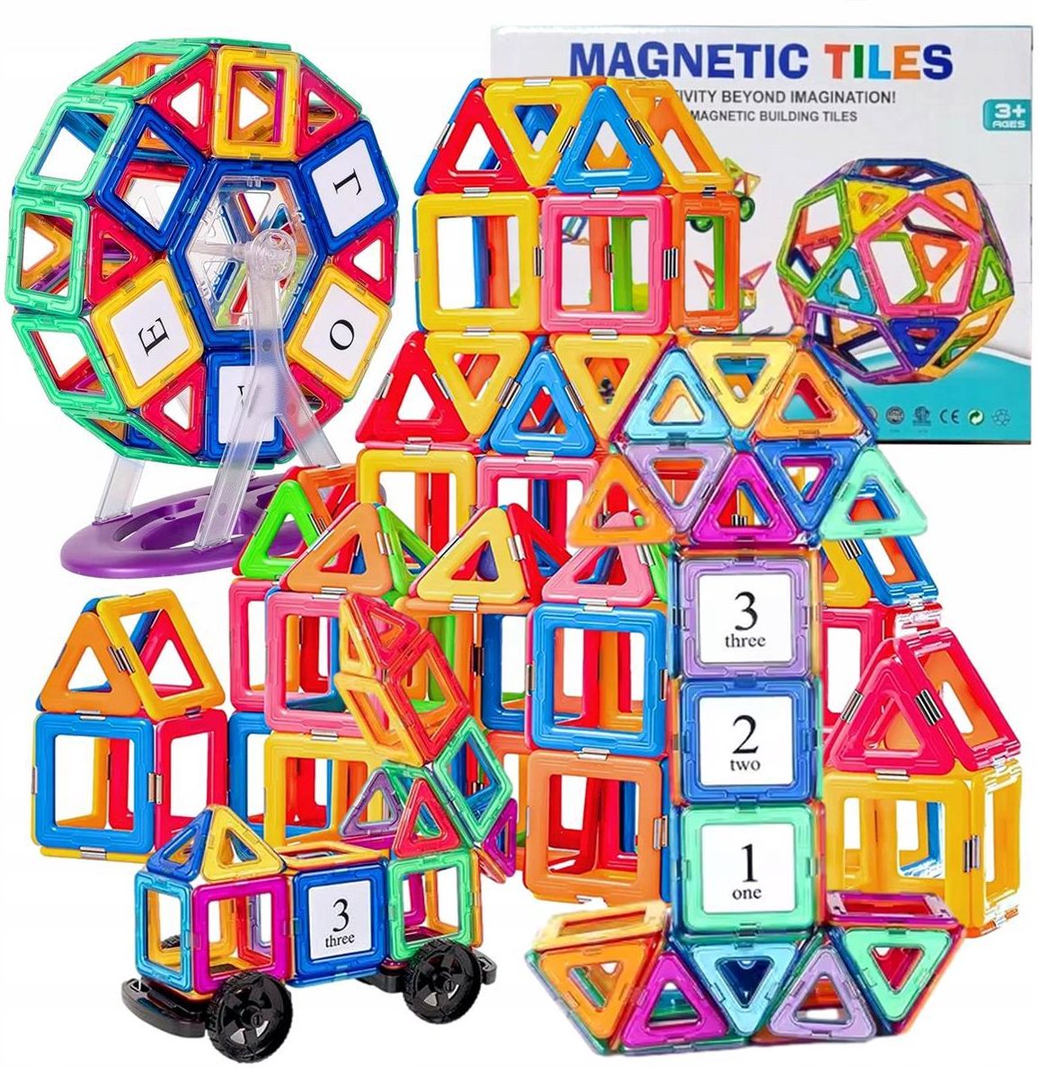 KLOCKI MAGNETYCZNE TĘCZOWE 3D - DUŻY ZESTAW 72 elementy - w zestawie Koło młyńskie i pojazdy. Klocki magnetyczne Magnetic Tiles - Twórcza zabawa bez końca. Odkryj magię kreatywności Magnetic Tiles to wyjątkowe klocki magnetyczne, które zachwycą każdego małego konstruktora! Dzięki solidnym magnesom i kolorowym elementom Twoje dziecko stworzy niezwykłe budowle, rozwijając przy tym zdolności manualne, kreatywność i wyobraźnię. Edukacja przez zabawę Rozwój - Koordynacja wzrokowo-ruchowa, umiejętności praktyczne, rozwiązywanie problemów, zdolności motoryczne i logiczne myślenie. Kreatywność - Zrób to sam, łącząc klocki magnetyczne z różnymi układami, aby poprawić kreatywność i wyobraźnię twoich dzieci. Praca interaktywna i zespołowa - Zabawka dla rodziców i przyjaciół, która wzmocni więzi Bezpieczeństwo i jakość - Plastikowe elementy budowlane wykonane są z wysokiej jakości materiału ABS, trwałego, łatwego do zbudowania i bezpiecznego dla dzieci. ZALETY KLOCKÓW MAGNETYCZNYCH Gładkie i starannie wykonane klocki Doskonale pasujące do siebie elementy - łatwa do zbudowania i stabilna konstrukcja Pozwalają na wspaniałą i długą zabawę Klocki magnetyczne są bardzo lekkie i do tego wytrzymałe Zabawa bez ograniczeń - pobudza wyobraźnię dzieci Zestaw jest prosty w montażu i demontażu Są świetnym atrybutem naukowym Zestaw posiada mocne magnesy neodymowe Oryginalne oraz kolorowe opakowanie, które idealnie nadaję się na prezent Zestaw umożliwia wielogodzinne zabawy, które docenią zarówno najmłodsi, jak i ich rodzice Różnokolorowe klocki będą doskonałą pomocą podczas nauki nazw kolorów lub liczenia W ZESTAWIE 24 x kwadraty 18 x trójkąty 6 x prostokąty 2 x sześciobok 16 x białe płytki niemagnetyczne 2 x podwozie 4 x koła Naklejki dekoracyjne WYMIARY OPAKOWANIA: 27 x 21 x 7 cm Kwadrat: 6,5 x 6,5 cm Klocki magnetyczne są zabawką uniwersalną i lubianą przez dzieci od najmłodszych lat. Nawet najmniejszy zestaw ma ogromne możliwości i mnogość konstrukcji możliwych do złożenia. Zestaw jest świetnym pomysłem na rozpoczęcie ciekawej przygody z konstruowaniem. Z ich pomocą dziecko poznaje kolory i kształty. Wspólne budowanie z klocków z rodzicami czy innymi dziećmi uczy dzielenia się i współdziałania. Klocki rozwijają koncentrację, koordynację wzrokową, wyobraźnie oraz kreatywność. Zestaw można rozbudowywać i powiększać kolejnymi klockami z tej samej seri