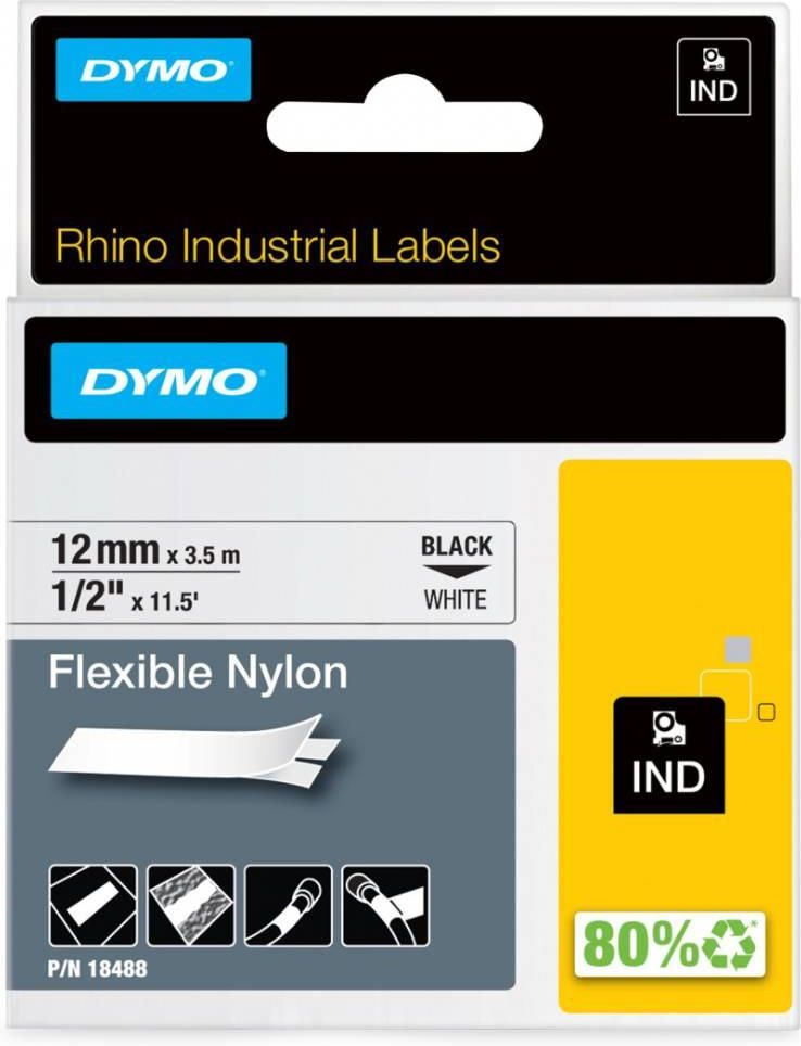 Rhino taśma nylonowa czarny nadruk na białym tle 12mm, model: 18488. Zamiennik wysokiej jakości. Zastosowanie: Taśma nylonowa przeznaczona do znakowania przewodów, kabli i zaokrąglonych powierzchni. Elastyczne etykiety nylonowe ściśle przylegają do przewodów, kabli oraz zaokrąglonych i chropowatych powierzchni. Odporny na rozerwanie materiał zapewnia wytrzymałość na uszkodzenia podczas przeciągania przez ciasne przestrzenie lub korytarze kablowe. Szerokość: 12 mm Długość: 3.5 m Nadruk: czarny Tło: białe Odporność na: temp. od -18°C do 90°C; promieniowanie UV, wodę, ogień, substancje chemiczne Gwarancja: Gwarancja producenta - 24 miesiące Opis: Taśma RHINO do opisów kabli i zaokrąglonych powierzchni.Taśmy nylonowe Dymo przeznaczone na krzywe powierzchnie, opis przewodów, kabli, zaokrąglonych oraz chropowatych powierzchni jak i płaskich, gładkich, równych powierzchni.Odporne na wysokie i niskie temperatury, promieniowanie UV, substancje chemiczne, wilgoć. Urządzenia kompatybilne: LabelWriter 400 Duo LabelWriter 450 Duo ILP 219 Rhino 5000 Rhino 5200 RhinoPro 6000 LabelManager LM100 LabelManager 100PLUS LabelManager LM 120 LabelManager LM 150 LabelManager 160 LabelManager LM 200 LabelManager LM 210 LabelManager 210D LabelManager LM 220 LabelManager LM 260 LabelManager 260P LabelManager LM 260D LabelManager LM 280 LabelManager LM 300 LabelManager LM 350 LabelManager 360D LabelManager 420P LabelManager 500TS LabelManager PnP LabelManager Wireless PnP ILP 219 Rhino 4200 RHINO 5200 RHINO 6000 LabelWriter LW 400 Duo LabelWriter LW 450 Duo LabelPoint LP 100 LabelPoint LP 200 LabelPoint LP 250 LabelPoint LP 350 oraz inne modele drukarek DYMO