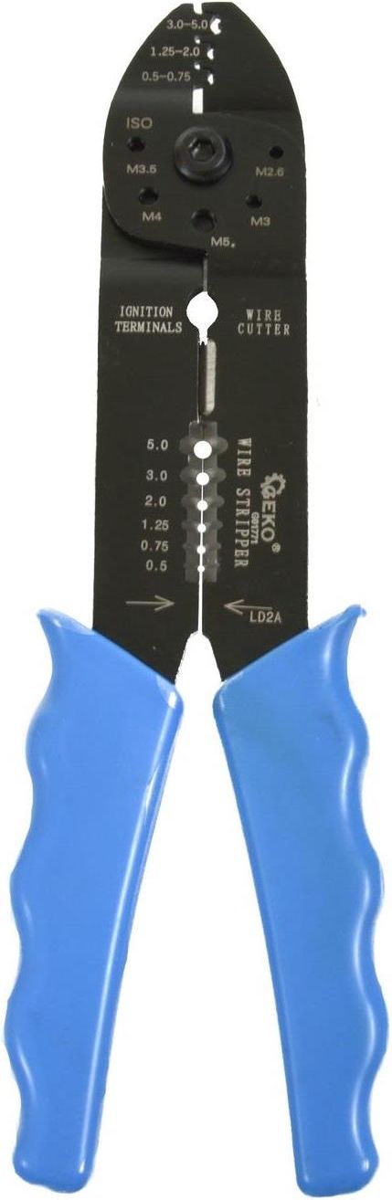 Zaciskarka do konektorów nieizolowanych 0,5-5mm2 firmy Geko numer katalogowy G01771 Zaciskarka do końcówek konektorowych. Posiada ściągacz izolacji, obcinarkę przewodów oraz obcinak śrub. Cechy produktu zdejmowanie izolacji z przewodów: 0.5, 0.75, 1.25, 2.0, 3.0, 5.0 mm2 obcinak śrub: M2.6, M3, M3.5, M4, M5 zaciskanie końcówek w zakresach: 0,5 - 0,75 mm2 / 1,25 - 2,0 mm2 / 3,0 - 5,0 mm2