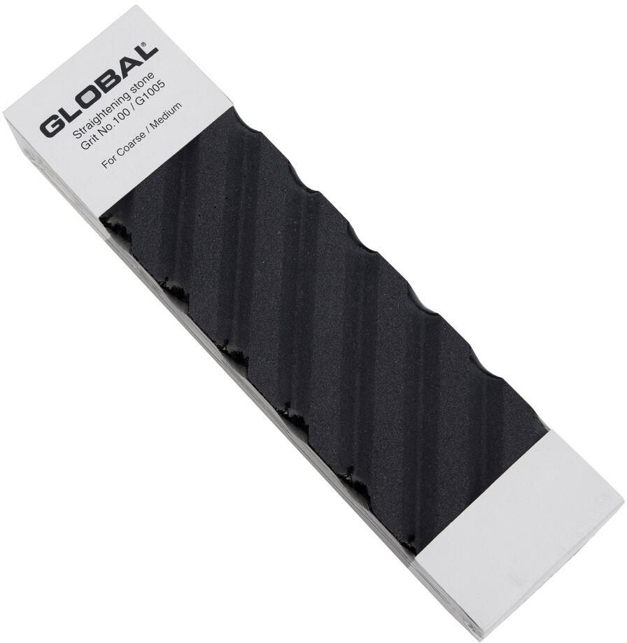 Kamień naprawczy rough & medium G1005 marki GLOBAL w kolorze czarnym. Ceramiczny kamień naprawczy marki Global, idealnie sprawdza się w usuwaniu nierówności na kamieniu. Przed użyciem należy zmoczyć go w wodzie. Dane techniczne: Wymiary - 20,6 x 5,3 x 2,7 cm Gradacja - 100 Podstawka w zestawie - brak Waga - 507 g. Przed ostrzeniem należy włożyć kamień do pojemnika z wodą. Należy go moczyć przez ok 10 – 15 minut. Po tym czasie, kamienną osełkę należy położyć na płaskiej powierzchni. Jeśli kamień nie ma antypoślizgowej powierzchni, wówczas należy umieścić go w specjalnej podstawce. W przypadku braku powłoki antypoślizgowej i braku podstawki, kamień wodny można położyć na miękkiej i mokrej ściereczce – ten zabieg również zapobiegnie przesuwaniu się kamienia podczas ostrzenia.
