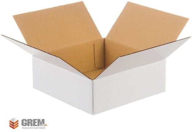 Komplet 20 sztuk białych pudeł kartonowych klapowych o wymiarach zew. 200x200x150 mm (dł/szer/wys). Opakowania wykonane są z trzywarstwowej tektury falistej (fala B) o gramaturze 365 g/m2.