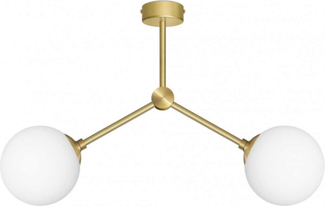 Złota lampa wisząca z dwoma pełnymi kulami. - Wykonana w całości z elementów z pełnego mosiądzu (brak elementów stalowych). - Kolor lampy: złoty.- Klosze szklane białe matowe o średnicy 16cm (zamknięta kula).- Wymiary całkowite: wysokość 40cm (lub inna - zmiana wysokości nie wpływa na czas realizacji, nową wysokość proszę wpisać w żółtym polu Uwagi w Koszyku, a w razie wątpliwości prosimy o kontakt. Strona informacyjna Zmiany w lampach), szerokość 67cm, średnica klosza 16cm.- Typ mocowania: wspornik (montowany do sufitu na dwóch wkrętach).- Żródło światła: 2xE14 (żarówki tradycyjne/żarowe o mocy max. 40W) lub żarówki energooszczędne albo LED o większej mocy (np. odpowiednik 70W). UWAGA! Otwór montażowy klosza ma średnicę 47mm, dlatego zastosowane żarówki E14 mogą mieć maksymalną średnicę 46mm.- UWAGA! Żarówki nie są dołączone do lampy. Lampa jest fabrycznie nowa, wyprodukowana w Polsce. Gwarancja: 24 miesiące. Seria GP - zobacz wszystkie lampy