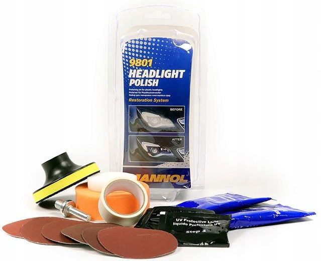 Mannol Headlight Polish Zestaw polerski do reflektorów. Polerski zestaw do renowacji ręcznej starych, pożółkłych reflektorów samochodowych. Użycie zestawu Mannol 9801 sprawi, że reflektory będą wyglądały jak nowe. Zestaw Mannol Headlight Polish zawiera 1 szt. talerz szlifierski z mocowaniem na rzepy (na przykład do wkrętarek akumulatorowych) 2 szt. ściernica 2000 2 szt. ściernica 1200 2 szt. ściernica 800 1 szt. taśma maskująca 3000 x 20 mm 2 szt. pasta do polerowania 40 g 1 szt. gąbka polerska (pomarańczowa) 1 szt. gąbka wykończeniowa (biała) 2 szt. nano uszczelniacz chroniący przed promieniowaniem ultrafioletowym 7,5 ml Nr kat: 9801 Właściwości Mannol Headlight Polish Uniwersalne Zastosowanie: Zestaw jest przeznaczony do ręcznego i mechanicznego polerowania uszkodzonych, zmętniałych lub pożółkłych plastikowych reflektorów oraz szyb pojazdów mechanicznych i małych jednostek pływających. Szybkie i Skuteczne: Dzięki prostemu procesowi aplikacji, przetwarzanie pojedynczego reflektora zajmuje średnio tylko 30 minut. Doskonałe Wyniki: Pozwala osiągnąć idealny stopień polerowania powierzchni, przywracając jasność reflektorów i zwiększając widoczność oraz bezpieczeństwo jazdy. Sposób Użycia Mannol Headlight Polish oczyścić powierzchnię klosza reflektora użyć taśmy maskującej, aby zabezpieczyć sąsiadujące elementy pojazdu przed uszkodzeniem zwilżyć powierzchnię i równomiernie szlifować. Należy przestrzegać kolejności używania papieru ściernego: 800 > 1200 > 2000. za pomocą gąbki polerskiej (pomarańczowej) i pasty, polerować reflektor do momentu uzyskania błyszczącej, przeźroczystej powierzchni oczyścić i dokładnie wysuszyć reflektor białą gąbką wykończeniowa nanieść nano uszczelniacz chroniący przed promieniowaniem ultrafioletowym i wypolerować w ciągu 1 minuty pozostawić do wyschnięcia na około 2 godziny