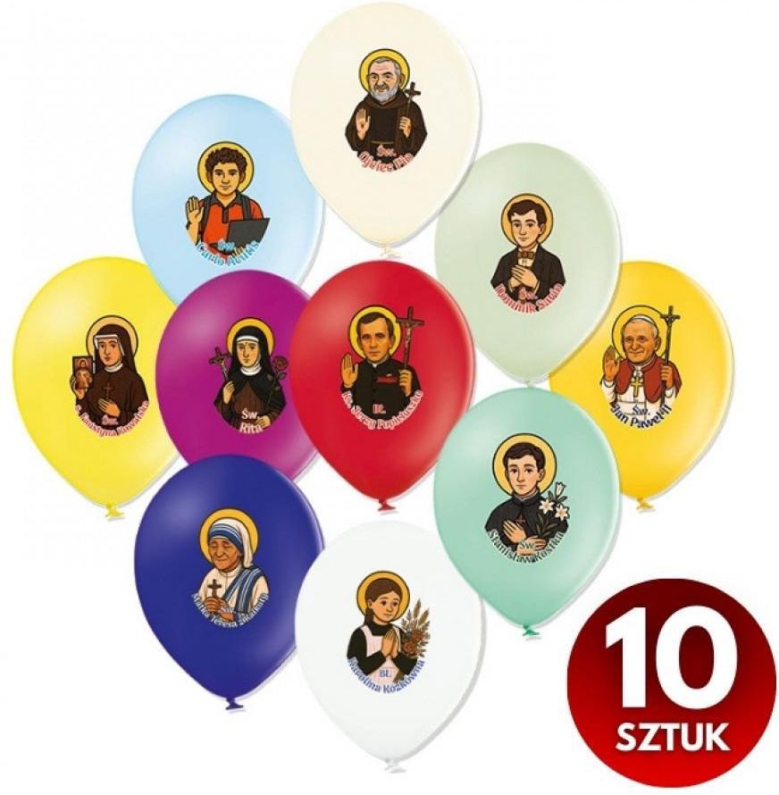 Zestaw kolorowych balonów z wizerunkami wybranych świętych. Polecamy na Bale Wszystkich Świętych, odpusty i festyny parafialne, Marsze Trzech Króli, Marsze Dla Życia i Rodziny. W zestawie znajdują się balony z wizerunkami popularnych świętych i błogosławionych: św. Jan Paweł II, św. Matka Teresa z Kalkuty, św. Dominik Savio, św. Carlo Acutis, św. s. Faustyna Kowalska, św. Ojciec Pio, św. Stanisław Kostka, św. Rita, bł. ks. Jerzy Popiełuszko, bł. Karolina Kózkówna. Każdy z balonów jest w innym kolorze co sprawia, że są atrakcyjne i różnorodne. Z balonów można tworzyć piękne dekoracje i będą idealne do sesji zdjęciowych. Wykonane z wysokiej jakości lateksu, są trwałe i łatwe do nadmuchania. Balony można pompować powietrzem lub helem. Średnica: 30 cm Ostrzeżenie: Zabawka nieodpowiednia dla dzieci poniżej 36 miesięcy. Używać wyłącznie pod nadzorem osoby dorosłej. Dzieci poniżej 8. roku życia mogą udławić się lub udusić nienadmuchanymi albo pękniętymi balonami. Zalecany stały nadzór osoby dorosłej. Nienadmuchane balony przechowywać poza zasięgiem dzieci. Podmiot odpowiedzialny: Dom Wydawniczy Rafael H. Marchut, T. Balon - Mroczka sp.j, ul. Grzegórzecka 25, 31-532 Kraków, Polska e-mail: rafael@rafael.pl, tel. 12 411-14-52