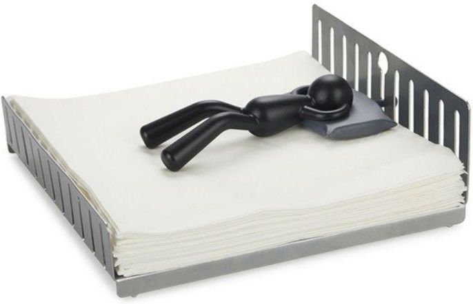 Przedstawiamy pięknie wykonany, zaprojektowany w Barcelonie serwetnik, który będzie się wspaniale prezentował na Twoim stole. Stojak jest wykonany w całości z metalu, ciężki i solidny gadżet. W zestawie znajduje się również element dociskający serwetki w postaci leżącego na poduszce ludzika, który jest wykonany z tworzywa wysokiej jakości. SPECYFIKACJA: Stojak na Serwetki (Nap Napkin Holder) Serwetnik pomieści do około 30 dużych serwetek Materiał: metal oraz tworzywo wysokiej jakości Wymiary: 20 x 20 x 7.5cm Waga: 0.7kg Czyszczenie: za pomocą wilgotnej ściereczki