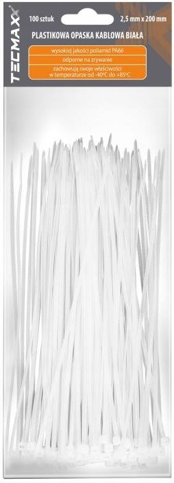 Tecmaxx - Plastikowa opaska kablowa biała 2,5mm x 200 100szt Wykonane z wysokiej jakości poliamidu PA66. Certyfikat UL. Zachowują swoje właściwości w dużym zakresie temperatur od -40oC do +85oC. Klasa palności 94V-2. Szerokie spektrum zastosowań np. spinanie i wiązanie wiązek przewodów, elementów montażowych. Produkt jednorazowego użycia.Dostępny w różnych rozmiarach.