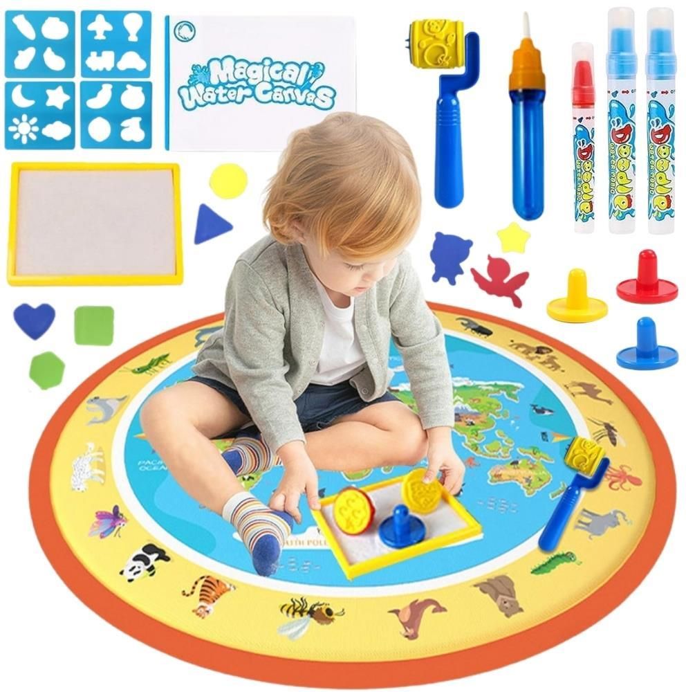 Magiczna mata wodna Magical Water Canvas od marki Woopie to kreatywna i edukacyjna zabawka, która zachwyci każde dziecko. Dzięki specjalnym pisakom wodnym malowanie jest całkowicie bezpieczne – wystarczy woda, aby tworzyć niesamowite rysunki i wzory. Kolorowa mapa świata z zaznaczonymi zwierzętami sprawia, że zabawa staje się także okazją do nauki geografii i poznawania przyrody. W zestawie znajdują się liczne akcesoria: stempelki, szablony, wałek, pisaki i gąbka – które urozmaicają twórczość. To idealny pomysł na prezent, który rozwija wyobraźnię i gwarantuje godziny radosnej zabawy bez bałaganu. Charakterystyka - Duża, okrągła mata wodna 80 × 80 cm - Wzór mapy świata z ilustracjami zwierząt - Malowanie tylko wodą – 100% bezpieczne i czyste - Kolorowe pisaki wodne wielokrotnego użytku - Szablony i stempelki do urozmaicania zabawy - Odpowiednia dla dzieci od 3 roku życia Zestaw zawiera - Mata wodna okrągła 80 × 80 cm z mapą świata - 3 pisaki wodne - 1 pędzelek - 4 szablony (niebieskie wzory do odrysowywania) - 8 kształtów (różne figury i zwierzątka) - 3 stempli z wałkiem do malowania - 1 Wałek do odbijania wzorów Zabawka rozwija - Kreatywność i wyobraźnię dziecka - Zdolności plastyczne i manualne - Wiedzę o zwierzętach i kontynentach - Umiejętność logicznego myślenia i kojarzenia - Wspólną zabawę i współpracę w grupie