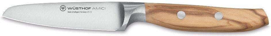 Nóż do warzyw marki Wusthof linii Amici o długości 9 cm. Precyzyjnie wykute z jednego kawałka stali ostrze o twardości 58 w skali Rockwella. Laserowy proces ostrzenia sprawia, że nóż pozostanie ostry przez długi czas. Rękojeść wykonana jest z drewna oliwnego, które jest naturalnie wodoodporne i ma właściwości anty-bakteryjne. Nóż należy myć bezpośrednio po użyciu w ciepłej wodzie używając łagodnych środków myjących. Długość całkowita 20,6 cm.