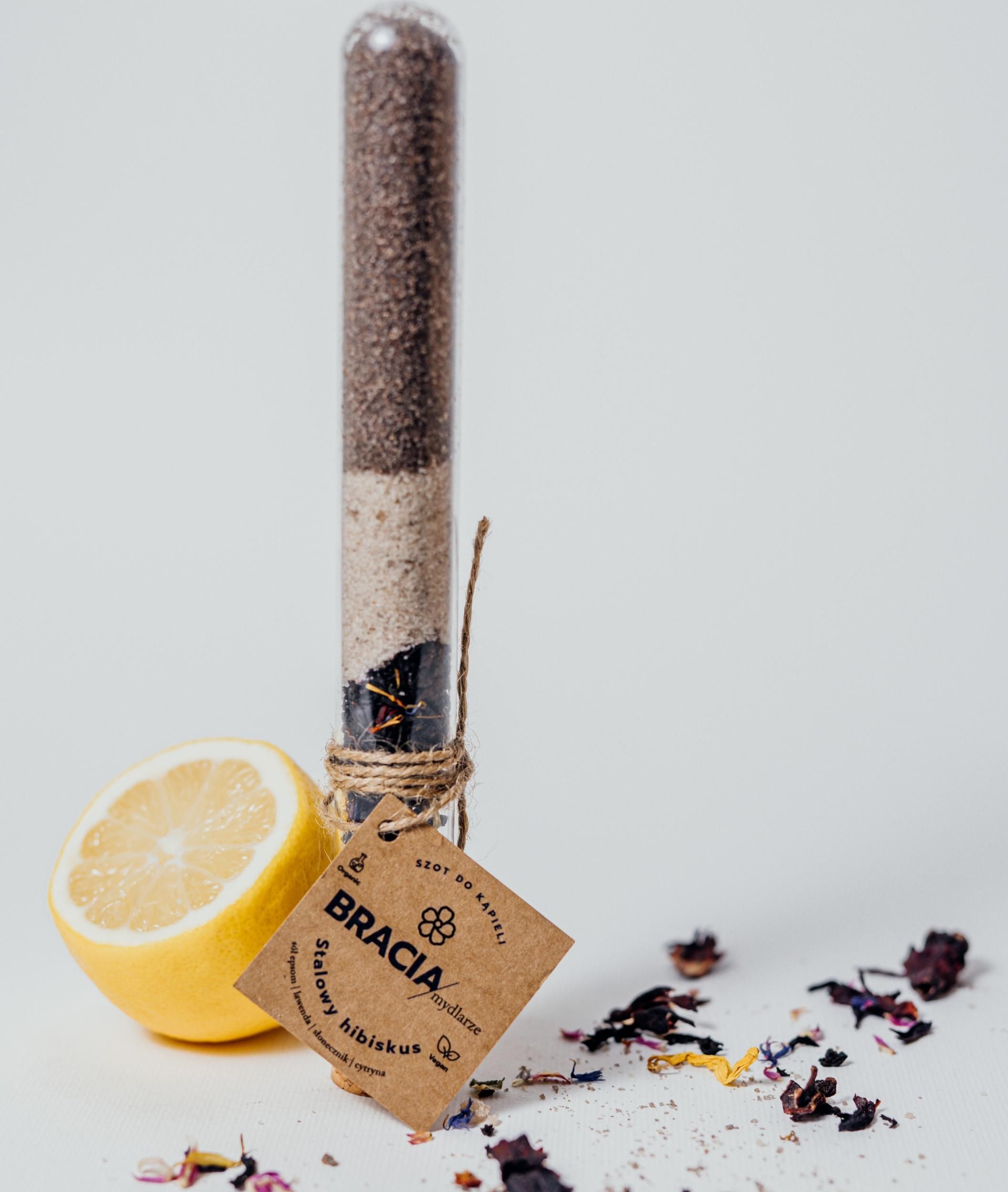 Bracia Mydlarze, Stalowy hibiskus szot do kąpieli Unikalna mieszanka, której potężna formuła skupia się na regeneracji ciała i relaksie umysłu. Sól himalajska, bogata w minerały, nawilża skórę i stymuluje procesy regeneracyjne, oferując jednocześnie głęboki relaks. Sól magnezowo-potasowa dostarcza niezbędnych minerałów, wspierając regenerację mięśni i przynosząc ulgę po wysiłku fizycznym. Dodatkowo, kwiaty hibiskusa, z ich bogactwem antyoksydantów, wspomagają procesy naprawcze skóry, przywracając jej jędrność. Czarna herbata Earl Grey, znana ze swoich właściwości tonizujących, relaksuje i ożywia zmysły podczas kąpieli. Olejek eteryczny z bergamotki, o delikatnym zapachu, działa antyseptycznie i relaksująco, wspierając równocześnie regenerację skóry. To niezwykłe doświadczenie, gdzie regeneracja staje się rytuałem odprężenia dla ciała i duszy. Co się znajduje w składzie? SÓL HIMALAJSKA Sól himalajska, główny składnik szotu do kąpieli, to naturalne źródło minerałów, które nawilża i odżywia skórę. Jej unikalne właściwości relaksacyjne i stymulujące regenerację sprawiają, że kąpiel staje się niezapomnianym rytuałem odprężenia, ożywiając ciało i umysł. SÓL MAGNEZOWO-POTASOWA Sól magnezowo-potasowa to element, dostarczający organizmowi niezbędne minerały. Jej intensywne działanie łagodzi napięte mięśnie, wspomaga regenerację po wysiłku fizycznym i przynosi uczucie odprężenia, relaksując ciało. KWIATY HIBISKUSA Kwiaty hibiskusa, dodane do szotu, pełnią rolę naturalnych antyoksydantów. Ich obecność wspomaga procesy naprawcze skóry, przywracając jej jędrność i elastyczność. To jak przyjemna kąpiel w ogrodzie pełnym kwitnących kwiatów, odmładzająca i relaksująca. CZARNA HERBATA EARL GREY Czarna herbata Earl Grey, znana z właściwości tonizujących, wzbogaca szot o delikatny aromat i działanie stymulujące. Jej obecność relaksuje zmysły, ożywiając jednocześnie skórę i dodając kąpieli wyjątkowej elegancji. OLEJEK ETERYCZNY Z BERGAMOTKI Olejek eteryczny z bergamotki to finalny akcent, działający antyseptycznie i relaksująco. Jego subtelny zapach dodaje kąpieli delikatności, wspierając proces regeneracji skóry i tworząc atmosferę błogiego spokoju. SPOSÓB UŻYCIA: Dodaj zawartość tuby do wanny wypełnionej ciepłą wodą. Ciesz się swoją kąpielą, to chwila tylko dla Ciebie. Na koniec spłucz ciało wodą. OPAKOWANIE: szklana tuba o wymiarach 25x200mm z naturalnym korkiem ZAPACH: cytrusowy; kalabryjska bergamotka SKŁAD: Sól himalajska, sól magnezowo-potasowa, herbata earl grey, kwiat hibiskusa, olejek eteryczny bergamotowy, glinka czarna INCI: Pink Salt, Sodium Chloride, Camellia Sinensis Leaf, Hibiscus Rosa-Sinensis Flower, Citrus Aurantium Bergamia Fruit Oil*, Montmorillonite *Limonene, Linalool** **potencjalne alergeny POJEMNOŚĆ: 70 ml (wystarczy na jedną kąpiel) Produkt wykonany ręcznie. Powstaje w niewielkich partiach, każda z nich może nieznacznie różnić się wyglądem.
