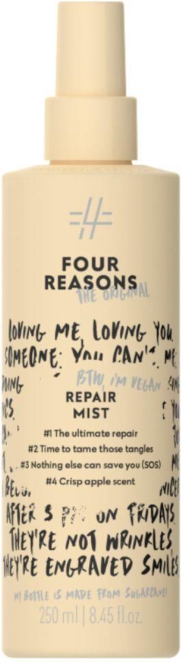 Four Reasons Original Repair Mist Four Reasons Original Repair Mist to zaawansowana mgiełka regenerująca, stworzona z myślą o intensywnej pielęgnacji włosów osłabionych i zniszczonych, szczególnie po zabiegach chemicznych. Jej unikalna formuła, oparta na synergii protein roślinnych i oleju arganowego, zapewnia kompleksową odbudowę struktury włosa, przywracając mu zdrowy wygląd i naturalną witalność.Właściwości i składniki aktywne:Proteiny roślinne:Wnikają głęboko w strukturę włosa, odbudowując u