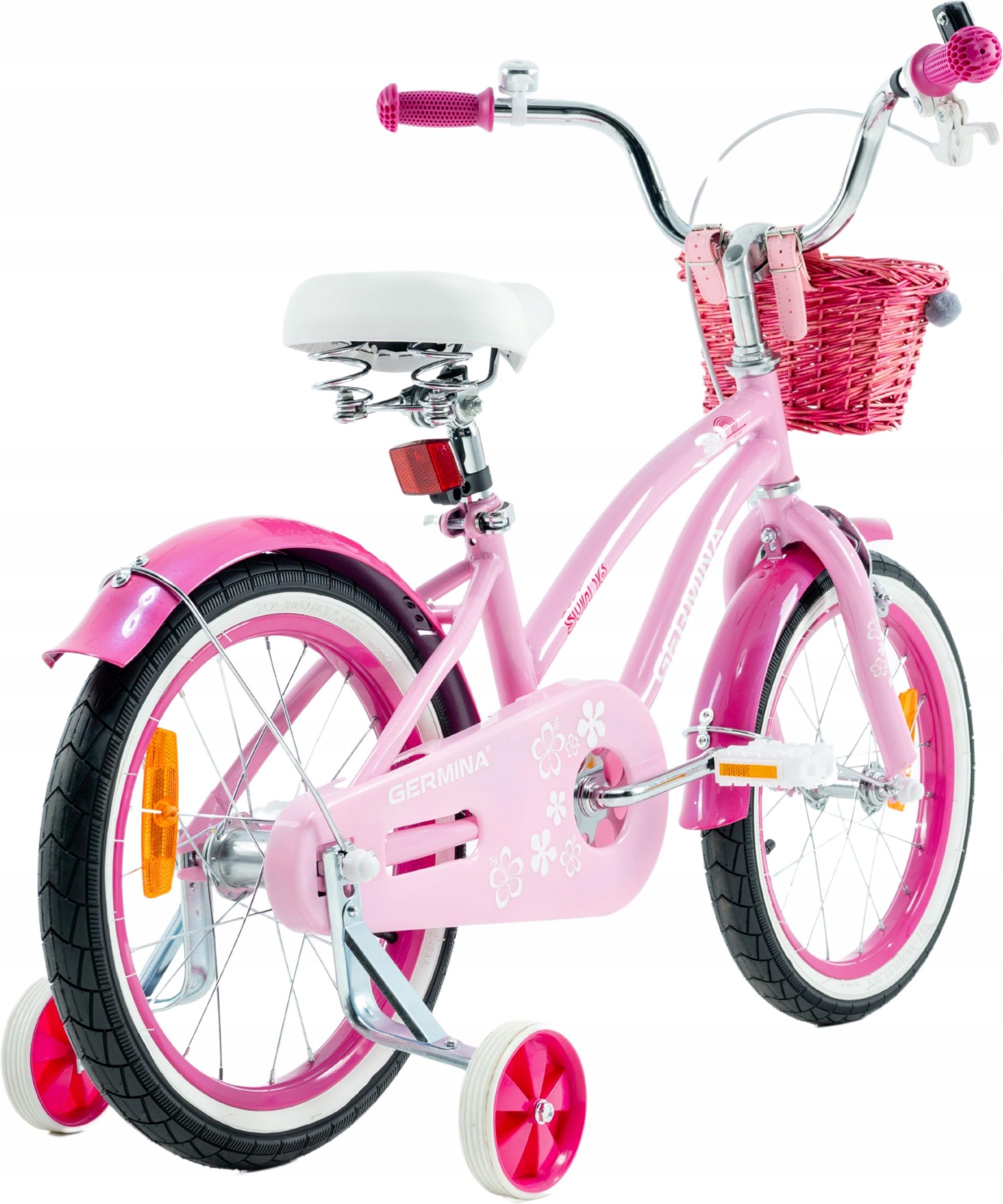 ROWER DZIECIĘCY GERMINA 16" Rower dziecięcy 16" Germina SUN KIDSPLZ16001 – różowa radość i bezpieczeństwo dla najmłodszych Model Germina SUN KIDSPLZ16001 to dziecięcy rower, który łączy stylową estetykę z wygodą codziennego użytkowania. Dzięki solidnej stalowej ramie, wysokiej jakości oponom oraz starannie dobranym dodatkom, rower idealnie sprawdzi się w nauce samodzielnej jazdy. Jasnoróżowa kolorystyka i wiklinowy koszyk z pomponami podkreślają przyjazny, dziecięcy charakter pojazdu. Lekka konstrukcja i wysoki komfort jazdy Rower wyposażono w niską ramę o rozmiarze 8,5", co znacznie ułatwia wsiadanie i zsiadanie. 16-calowe koła oraz szerokie opony zapewniają bardzo dobrą przyczepność na chodnikach, alejkach i w parkowych ścieżkach. Gumowe boczne kółka pomagają w nauce jazdy, zapewniając dziecku stabilność i pewność podczas pierwszych prób samodzielnego poruszania się. Systemy wspomagające bezpieczeństwo Germina SUN KIDSPLZ16001 posiada skuteczne hamulce – tylny typu torpedo oraz przedni typu caliper – które umożliwiają łatwą i intuicyjną kontrolę nad rowerem. Pełna osłona łańcucha chroni dziecko przed zabrudzeniami i zabezpiecza mechanizm napędowy przed uszkodzeniem. Odblaski zamontowane na kołach, z przodu i z tyłu roweru zwiększają widoczność małego rowerzysty na drodze. Praktyczne dodatki i funkcjonalne wyposażenie Na wyposażeniu znajduje się lekki, wiklinowy koszyk z dekoracyjnymi pomponami – idealny na drobne przedmioty podczas spacerów. Komplet błotników chroni ubrania przed zabrudzeniem w trudniejszych warunkach atmosferycznych, a zamontowany dzwonek pozwala dziecku bezpiecznie sygnalizować swoją obecność. Wszystkie elementy zostały starannie dobrane, by zapewnić maksymalny komfort i bezpieczeństwo jazdy. Design, który przyciąga uwagę Jasnoróżowy kolor ramy, dekoracje w formie białych kwiatków oraz delikatne akcenty na osłonie łańcucha i błotnikach tworzą spójną, dziewczęcą stylistykę. Estetyczne wykończenie i funkcjonalność sprawiają, że rower dziecięcy Germina SUN jest doskonałym wyborem dla młodych pasjonatek jazdy na dwóch kółkach. Specyfikacja techniczna roweru KIDSPLZ16001 Rodzaj: Rower dziecięcy 16". Marka: Germina. Materiał ramy: Stal. Rozmiar koła: 16". Rozmiar ramy: 8,5". Hamulec tył: Torpedo. Hamulec przód: Caliper. Osłona łańcucha: Pełna. Wyposażenie: Błotniki, dzwonek, koszyk, odblaski, kółka boczne. Przeznaczenie: Dla dzieci. Wiek dziecka: 4–6 lat. Wzrost dziecka: 105–125 cm. Kolekcja: SUN. Stopień złożenia roweru: 95%. Kolor: Jasnoróżowy. Opakowanie: Oryginalny karton. Zawartość opakowania Rower dziecięcy 16" Germina SUN KIDSPLZ16001 (złożony w 95%). Gumowane boczne kółka (do samodzielnego montażu). Wiklinowy koszyk z pomponami. Komplet błotników. Dzwonek. Komplet odblasków. Instrukcja montażu i obsługi (kierownica, pedały i boczne kółka do samodzielnego montażu).