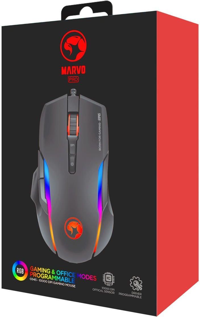Mysz Marvo G945 Pro (G945 PRO) Rodzaj sensora: Optyczny Profil myszy: Praworęczna Liczba przycisków: 9 Interfejs: USB Rodzaj myszy: Przewodowe Element kolorystyczny: Czarny Waga [g]: 105 Zasięg pracy: 1.8 m Regulacja czułości: Płynna Podświetlenie: RGB Kabel w oplocie: Tak Wysokość [mm]: 40 …