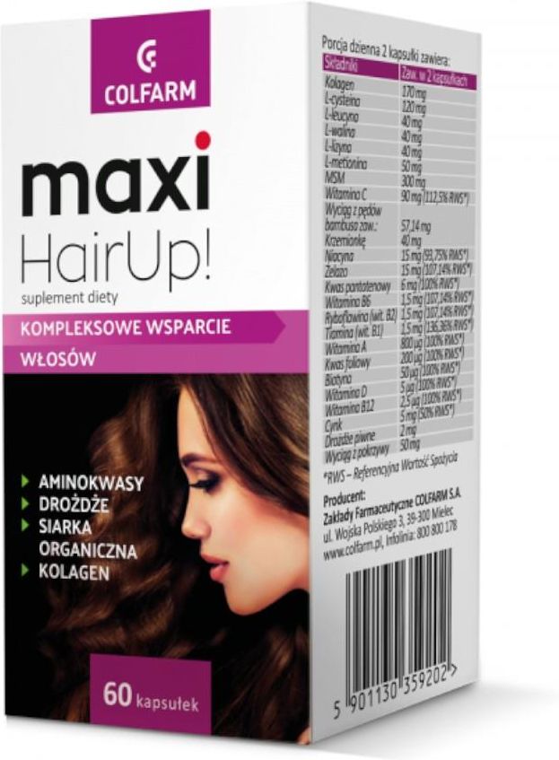 Suplement diety Colfarm Maxi HairUp! z kolagenem 60 kapsułek Suplement diety COLFARM Maxi HairUp! Maxi HairUp! to zaawansowany suplement diety, który zawiera bogaty kompleks składników wspomagających zdrowie i wygląd włosów oraz paznokci. Korzyści Biotyna: Wspomaga powstawanie cebulek włosa i wspiera ich wzrost, co przyczynia się do mocnych i zdrowych włosów. Wzmacnia również paznokcie, zapobiegając ich łamliwości. Kwas pantotenowy i wyciąg z ziela pokrzywy: Wzmacniają włosy i paznokcie, wspomagając ich zdrowy wygląd i wytrzymałość. Cynk: Korzystnie wpływa na prawidłowy stan włosów i paznokci, wspierając ich regenerację i zdrowy wygląd. Witamina C: Pomaga w prawidłowej produkcji kolagenu, co wspiera prawidłowe funkcjonowanie skóry, zapewniając jej elastyczność i nawilżenie. Kolagen: Wspomaga strukturę włosów i skóry, wspierając ich wytrzymałość i elastyczność. Ekstrakt z drożdży i MSM: Wspierają zdrowie włosów, wzmacniając ich strukturę i wspomagając ich wzrost. Maxi HairUp! Maxi HairUp! to kompleksowe wsparcie dla Twoich włosów i paznokci, które dzięki starannie dobranym składnikom wspomaga ich zdrowie, wzrost i piękny wygląd. Każda kapsułka dostarcza niezbędnych witamin, minerałów i wyciągów roślinnych, wspierając naturalne procesy regeneracyjne i odżywcze organizmu. Naturalne składniki Składniki w 1 kapsułce Kolagen: 170 mg L-cysteina: 120 mg L-leucyna: 40 mg L-lizyna: 40 mg L-metionina: 60 mg MSM: 300 mg Witamina C: 90 mg (112.5% RWS) Wyciąg z pędów bambusa zawierający krzemionkę: 57.14 mg (w tym krzemionka 40 mg) Niacyna: 15 mg (93.75% RWS) Żelazo: 15 mg (107.14% RWS) Kwas pantotenowy: 6 mg (100% RWS) Witamina B6: 1.5 mg (107.14% RWS) Ryboflawina (witamina B2): 1.5 mg (107.14% RWS) Tiamina (witamina B1): 1.5 mg (107.14% RWS) Witamina A: 800 µg (100% RWS) Kwas foliowy: 200 µg (100% RWS) Biotyna: 200 µg (100% RWS) Witamina D3: 5 µg (100% RWS) Witamina B12: 2.5 µg (100% RWS) Cynk: 10 mg (100% RWS) Drożdże piwne: 2 mg Wyciąg z pokrzywy: 50 mg Sposób użycia Zalecany sposób użycia Zalecane dzienne spożycie: 1 kapsułka 2 razy dziennie Opakowanie: Produkt dostępny jest w opakowaniu zawierającym 60 kapsułek. Ostrzeżenia dotyczące bezpieczeństwa Nie stosować w przypadku nadwrażliwości na którykolwiek składnik suplementu. Suplementy diety nie mogą być stosowane jako substytut (zamiennik) zróżnicowanej diety ani zdrowego trybu życia. Nie należy przekraczać zalecanej porcji produktu do spożycia w ciągu dnia. Suplementy diety powinny być przechowywane w sposób niedostępny dla małych dzieci. Przed zastosowaniem produktu sugerujemy zapoznanie się z dokładnymi informacjami podanymi na opakowaniu lub załączonej ulotce.