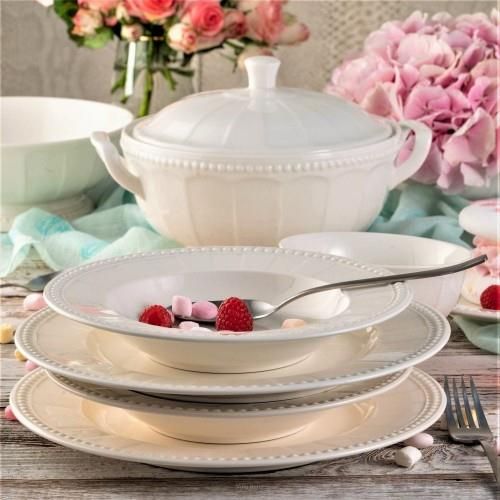 Serwis obiadowy dla 12 osób Venice White wraz z wazą Niezwykle elegancki serwis obiadowy z kolekcja ceramiki w nowym, mlecznym odcieniu i klasycznym fasonie. Serwis obiadowy i pozostałe elementy kolekcji wyróżniają się przepięknym kształtem naczyń i charakterystycznymi uchwytami filiżanek, czajnika i mlecznika, kubków, bulionówek, wazy. Niezwykłej lekkości całej kolekcji nadają stylowe stopki naczyń. Najbardziej rozpoznawalny fason Villa Italia w nowej odsłonie kolorystycznej. Dawny, zdecydowany kremowy odcień został zastąpiony nowym, jaśniejszym odcieniem śmietankowej bieli. Serwis obiadowy i cała zastawa Venice White doskonale sprawdzi się zarówno w codziennym użytkowaniu jak również, przy doborze odpowiednich dodatków, jako nakrycie stołu na wyjątkowe okazje. Wszystkie elementy można bezpiecznie myć w zmywarce i używać w kuchence mikrofalowej. Serwis obiadowy zawiera: 12 talerzy płytkich (średnica 27 cm) 12 talerzy głębokich (średnica 23 cm) 12 talerzy deserowych (średnica 21 cm) 2 półmiski owalne (długość 34 cm) 2 salaterki (średnica 21 cm) wazę (pojemność 2,2 litra)