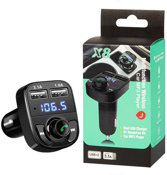 TRANSMITER FM BLUETOOTH UNIWERSALNY + ŁADOWARKA 3,1A ZESTAW GŁOŚNOMÓWIĄCY FM X8 CZARNY TRANSMITER FM Samochodowy transmiter FM Bluetooth to idealne rozwiązanie dla samochodów z radiem które nie posiada wejścia USB ani funkcji Bluetooth.Transmiter z funkcją zestawu głośnomówiącego umożliwia wygodne i bezpieczne prowadzenie rozmów telefonicznych - ma wbudowany czuły mikrofon, a rozmowę słychać w głośnikach samochodowych.Transmiter odtwarza muzykę z telefonu przez Bluetooth, pendrive (przez USB) lub z karty pamięci (przez slot na karty SD)Urządzenie posiada bardzo małe wymiary ułatwiające montaż w ciężko dostępnych gniazdach zapalniczek.Wbudowana ładowarka USB 3,1AGłówne funkcje:Wysoka jakość, niska cena, rzeczywisty prąd, bezpieczne użytkowanieNadajnik FMWyświetlacz cyfrowyŁatwe do zainstalowaniaObsługuje nośniki pamięci USB, karty microSD , obsługuje format muzyczny MP3 / WMAOdbieranie przez Bluetooth, rozłączanie, odrzucanie, ponowne wybieranie połączeń i inne funkcjeTechnologia eliminacji echa i tłumienia szumów (CVC) podczas połączeniaMożna odtwarzać muzykę z telefonu za pośrednictwem radia FM.Wbudowana ładowarka USB 2,1AFunkcja automatycznego wyłączania zasilaniaModna, kompaktowa konstrukcja, idealny prezent.Prosty w obsłudze.Specyfikacja:Stan: NowyKolor: CzarnyCzęstotliwość FM: 87,5-108,0 MHzFormat muzyczny: MP3 / WMAWyjście 2xUSB: 5V 3,1A+ 5V 1ASNR:> 60 dBStopień zniekształcenia: <0,1%Pasmo przenoszenia: 20Hz-20KHzTryb FM: Blokada częstotliwości cyfrowej PLL stereoPrzetwarzanie dźwięku przez Bluetooth: obsługiwany profil A2DP (Advance Audio Distribution)Zasięg transmisji: 5mWersja: BoxKOLOR MOŻE NIEZNACZNIE RÓŻNIĆ SIĘ OD TEGO NA ZDJĘCIACH!