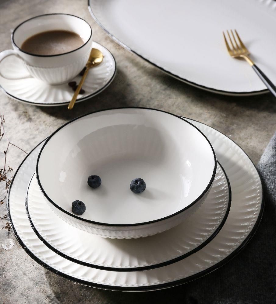 Serwis obiadowy na 6 osób PILLAR Zestaw obiadowy Pillar zachwyca ciekawym wzornictwem z nutą nostalgii oraz starannym wykonaniem. Naczynia zrobione są z porcelany w mlecznym odcieniu bieli. Są solidne i doskonałe do codziennego użytkowania. Można je myć w zmywarce i używać w kuchence mikrofalowej. Wszystkie naczynia zdobią podobne wzory, złożone z wklęsłych i wypukłych elementów: karbowań, linii i kropek. Charakteru dodają zastawie czarne, ręcznie malowane obwódki. Serwis obiadowy Pillar zawiera niezbędne talerze: płytkie, śniadaniowo-deserowe, pojemne talerze głębokie (miski), oraz duży półmisek i salaterkę. Seria Pillar obejmuje bogaty wybór naczyń do każdego posiłku, kawy czy herbaty, a także akcesoria kuchenne. Dzięki temu komplet zastawy Pillar będzie prezentował się spójnie i stylowo na stole. Naczynia Pillar sprawdzą się nawet jako dekoracja kuchni bądź jadalni. Wszystko to sprawia, że zastawa ta ma ogromną szansę stać się Twoją ulubioną. Skład serwisu obiadowego na 6 osób - 6 talerzy płytkich 26 cm - 6 talerzy głębokich 18 cm, poj. 700 ml (mierzona fabrycznie do krawędzi naczynia) - 6 talerzy deserowych / śniadaniowych 21 cm - 1 półmisek owalny dł. 36,5 cm, szer. 23 cm - 1 salaterka śr. 20 cm, wys. 9,5 cm Zestaw zawiera wyłącznie elementy wymienione w niniejszym opisie produktu. Pozostałe przedmioty widoczne w galerii zdjęć nie stanowią elementów tego zestawu, lecz część aranżacji.