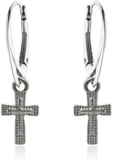 Delikatne wykonane ze srebra wiszące kolczyki na angielskim zapięciu z ozdobą o kształcie krzyżyka z wyciskanym wzorem, model K3417.