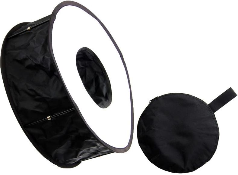 Dyfuzor reporterski Ring Round Flash Średnica: 45 cm Idealne rozwiązanie do fotografii produktowej oraz modowej. Dyfuzor dobrze sprawdza się do uzyskania efektu oświetlenia pierścieniowego. Dyfuzor znacznie zmiękcza i rozprasza światło, dzięki czemu świetnie sprawdza się w pomieszczeniach, w których nie można wykorzystać światła odbitego. Do zastosowań reporterskich jest niezbędnym akcesorium dla każdego fotografa. Dzięki elastycznej opasce, dyfuzor można zamontować i zdjąć w prosty sposób. Dyfuzor jest składany, dzięki czemu możesz zabrać go ze sobą gdziekolwiek i kiedykolwiek potrzebujesz. Rozmiar uniwersalny, pasuje do większości lamp systemowych. Wygodny w przenoszeniu Softbox można złożyć i rozłożyć w szybki i łatwy sposób. Możesz zabrać go ze sobą gdziekolwiek i kiedykolwiek potrzebujesz. W zestawie dołączony jest pokrowiec do dyfuzora, który znacznie ułatwi przenoszenie sprzętu. Dzięki elastycznej opasce, montaż softboxa zajmuje kilka sekund. Idealne rozwiązanie do fotografii produktowej oraz modowej. Dyfuzor dobrze sprawdza się do uzyskania efektu oświetlenia pierścieniowego. Dzięki niemu możemy uzyskać charakterystyczny błysk w oczach oraz uwydatniana jest sylwetka modela. Odblaskowy srebrny materiał idealnie rozkłada światło emitowane przez lampę na powierzchni dyfuzyjnej, co powoduje równomierne rozłożenie światła w kadrze.