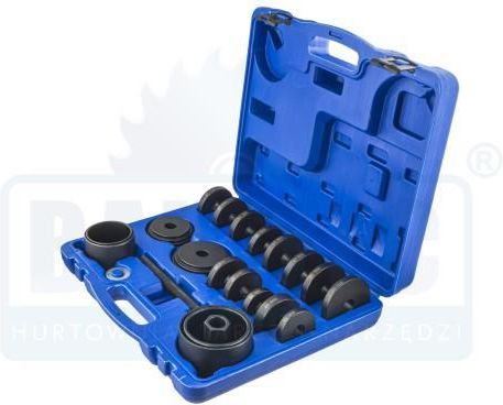 ŚCIAGACZ ŁOŻYSK PIASTY PRZEDNIEJ TULEI ADAPTERY OPIS PRODUKTU: Zestaw przeznaczony do wymiany łożysk kół przednich bezpośrednio na samochodzie za pomocą łożyskowanej śruby ściągającej. Szeroki wybór różnych rozmiarów misek i tulei dystansowych umożliwia zastosowanie do większości sprzedawanych samochodów. Zestaw jest odpowiedni także do stosowania na prasie hydraulicznej lub mechanicznej podczas demontażu łożysk, tulei i innych części obrotowych. Komplet zawiera 4 tuleje wyciskowe o długości 64 mm, 13 dysków do wyciskania łożysk ze średnicą wewnętrzną 20 mm, 2 dyski oporowe, nakrętkę i śrubę napędową o długości 190 mm, a napęd stanowi śruba w rozmiarze 27 mm oraz nakrętka w rozmiarze 32 mm. DANE TECHNICZNE: Długość : 190 mm Średnica tulei : 69, 77, 82, 94 mm Średnica grotu (mm): 20 mm